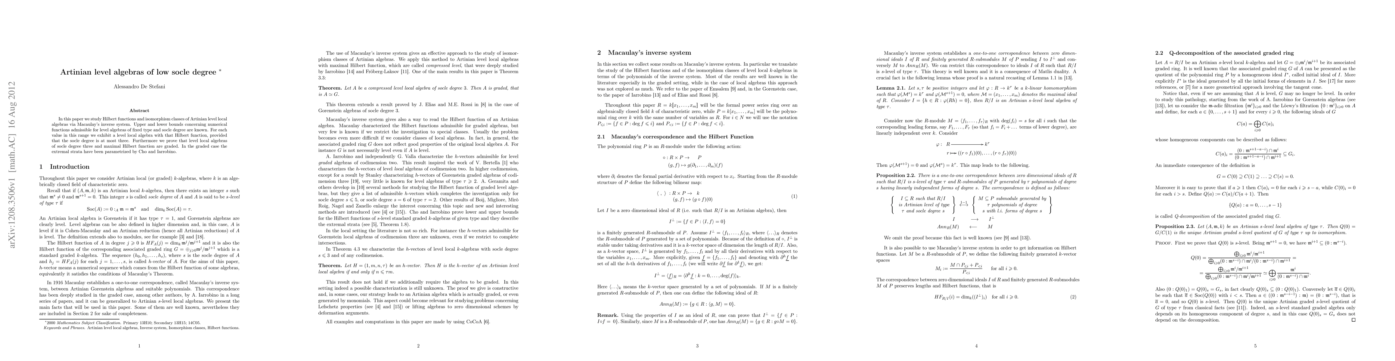 This paper investigates Hilbert functions and isomorphism classes of Artinian level local algebras using Macaulay's inverse system. It provides upper and lower bounds for numerical functions of level algebras with socle degree up to three, and demonstrates that for each value in this range, a corresponding level local algebra exists.