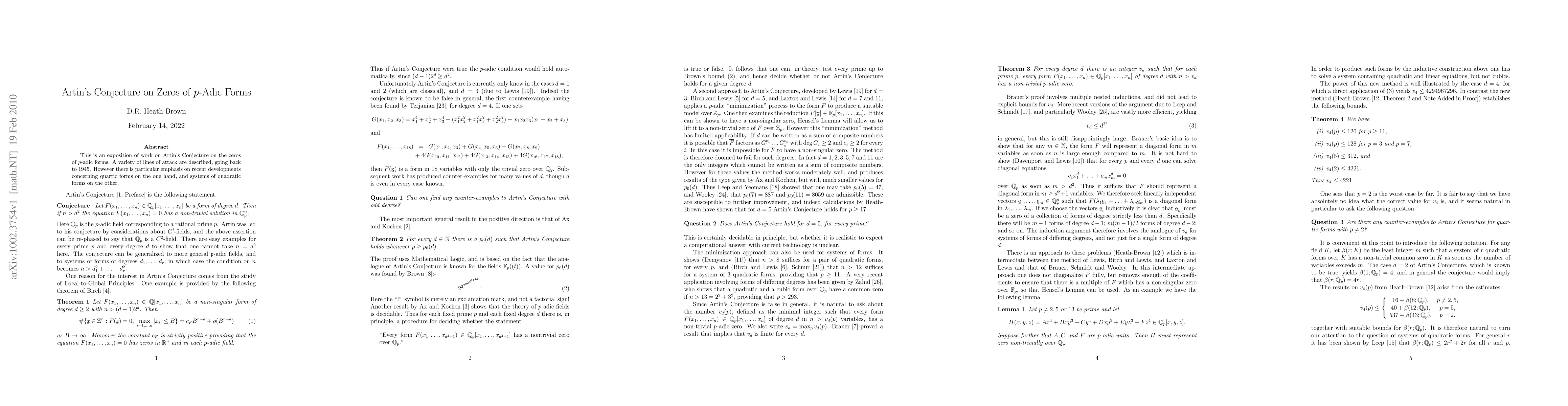 Summary: This paper explores Artin's Conjecture regarding the zeros of $p$-adic forms, detailing historical approaches and recent advancements, especially focusing on quartic forms and systems of quadratic forms.