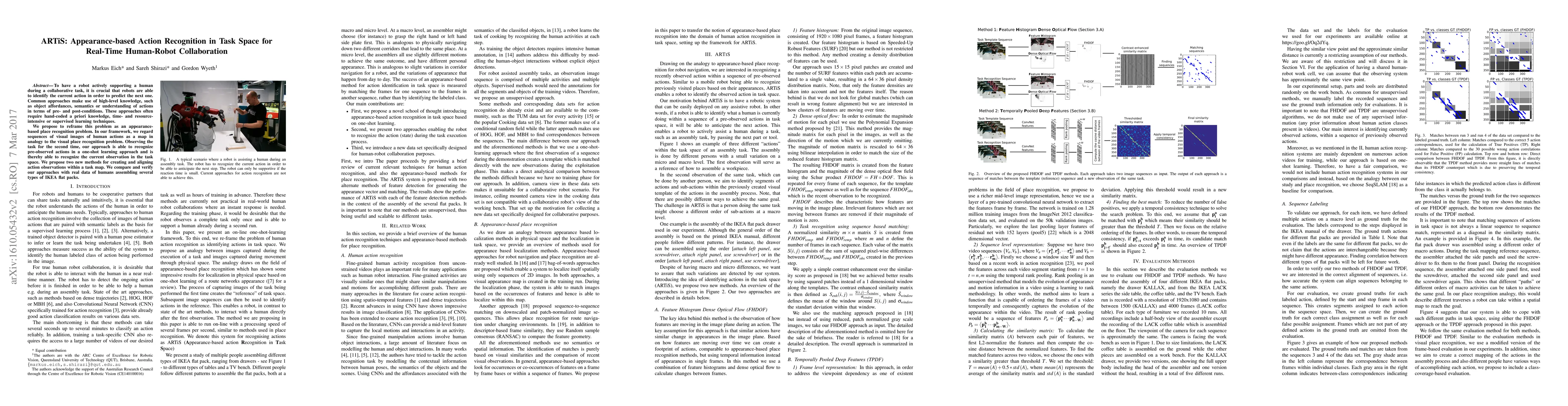 The ARTiS framework proposes an appearance-based approach for real-time human-robot collaboration by recognizing human actions through visual place recognition, enabling robots to predict future actions in a one-shot learning context without requiring extensive pre-coded knowledge. The method is validated using real data from human assembly tasks.