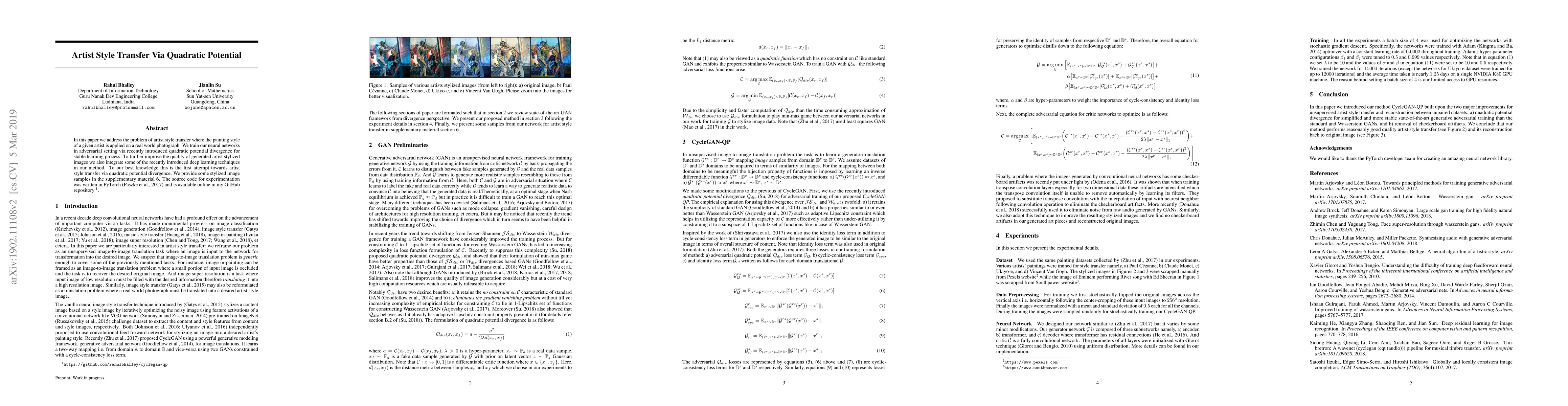 This paper introduces a novel method for artist style transfer using quadratic potential divergence, aiming to apply a given artist's style onto real-world photographs. The authors employ adversarial training and integrate advanced deep learning techniques to enhance the generated stylized images.