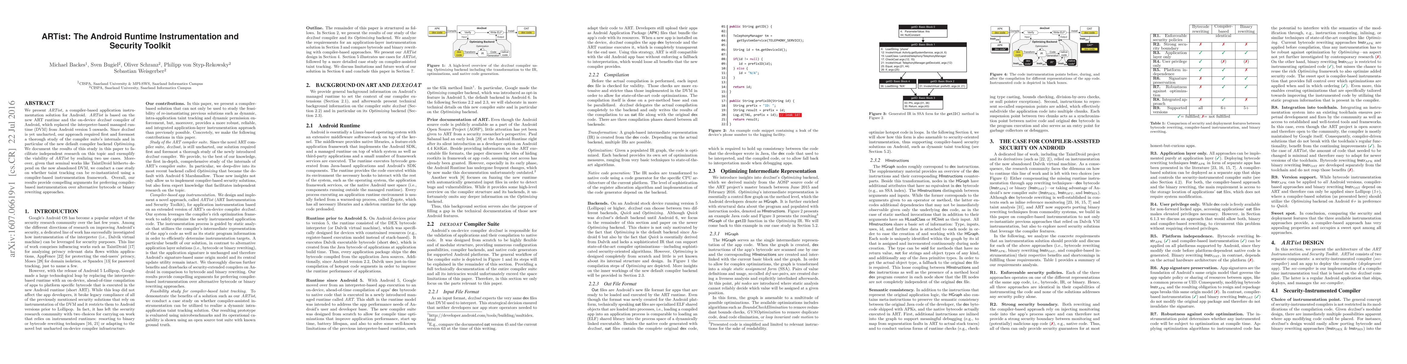 ARTist is a compiler-based instrumentation tool for Android's ART runtime, focusing on the dex2oat compiler. It demonstrates the feasibility of taint tracking in the new runtime, advocating for compiler-based instrumentation over traditional bytecode methods.