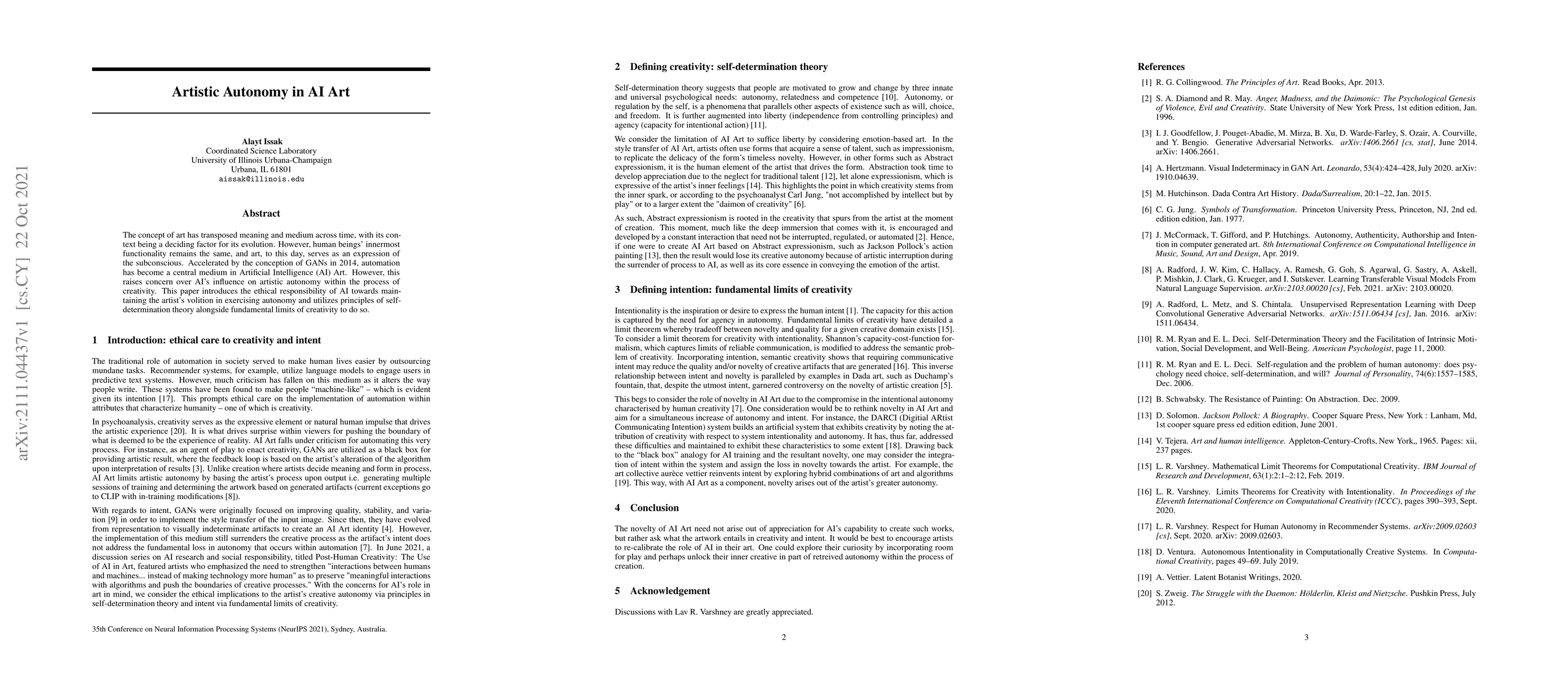 This paper explores the ethical implications of AI in art, emphasizing the need for AI to respect artistic autonomy and the artist's volition, using self-determination theory and the fundamental limits of creativity to guide AI's role in the creative process.