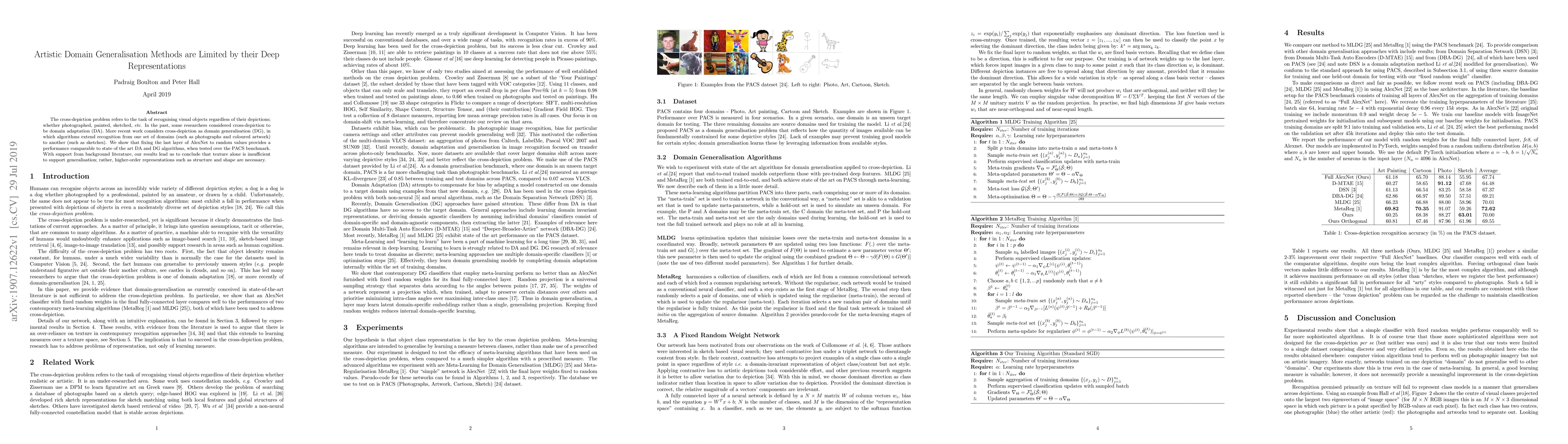 The cross-depiction problem refers to the task of recognising visual objects regardless of their depictions; whether photographed, painted, sketched, {\em etc}. In the past, some researchers considered cross-depiction to be domain adaptation (DA). More recent work considers cross-depiction as domain generalisation (DG), in which algorithms extend recognition from one set of domains (such as photographs and coloured artwork) to another (such as sketches). We show that fixing the last layer of AlexNet to random values provides a performance comparable to state of the art DA and DG algorithms, when tested over the PACS benchmark. With support from background literature, our results lead us to conclude that texture alone is insufficient to support generalisation; rather, higher-order representations such as structure and shape are necessary.
