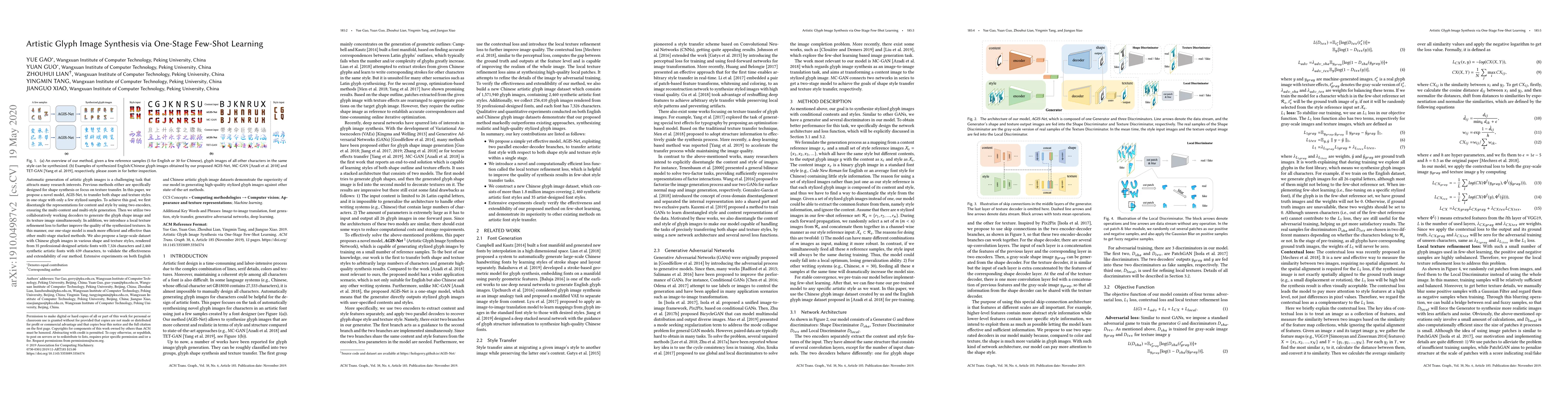 This paper introduces AGIS-Net, a one-stage few-shot learning model for synthesizing artistic glyph images by transferring both shape and texture styles using disentangled representations and collaborative decoders. The method is validated on a large-scale dataset of Chinese glyph images and outperforms other methods in generating high-quality stylized glyphs.