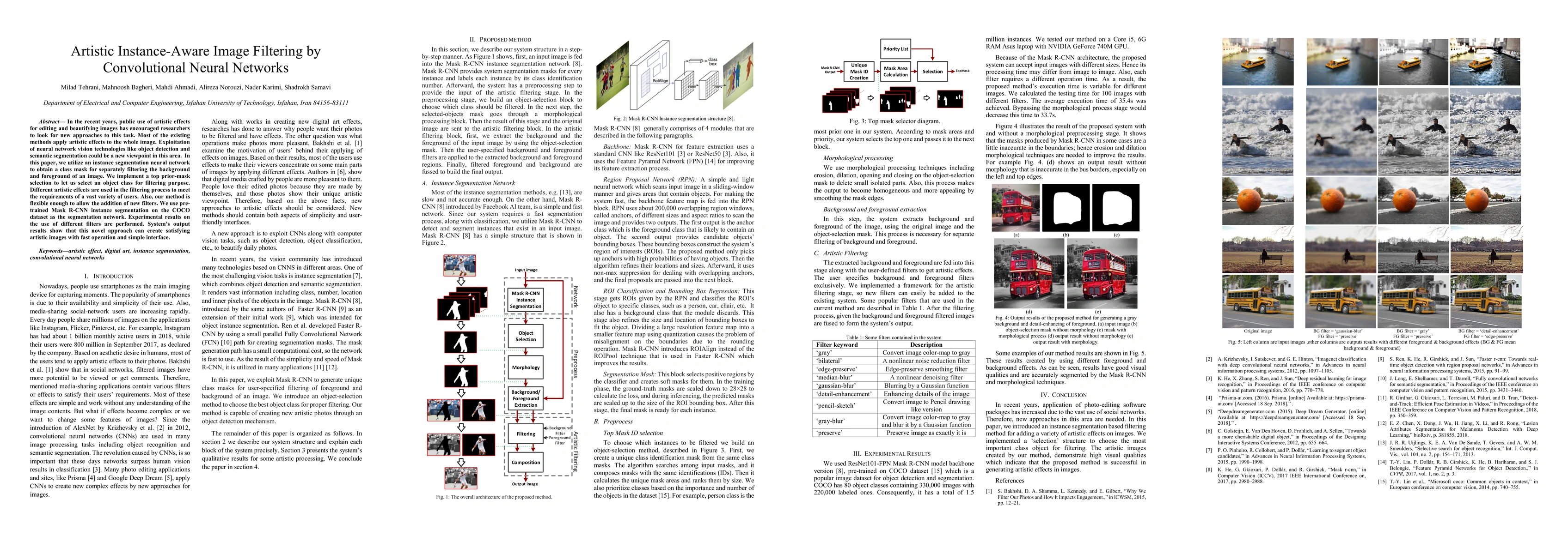 In the recent years, public use of artistic effects for editing and beautifying images has encouraged researchers to look for new approaches to this task. Most of the existing methods apply artistic effects to the whole image. Exploitation of neural network vision technologies like object detection and semantic segmentation could be a new viewpoint in this area. In this paper, we utilize an instance segmentation neural network to obtain a class mask for separately filtering the background and foreground of an image. We implement a top prior-mask selection to let us select an object class for filtering purpose. Different artistic effects are used in the filtering process to meet the requirements of a vast variety of users. Also, our method is flexible enough to allow the addition of new filters. We use pre-trained Mask R-CNN instance segmentation on the COCO dataset as the segmentation network. Experimental results on the use of different filters are performed. System's output results show that this novel approach can create satisfying artistic images with fast operation and simple interface.