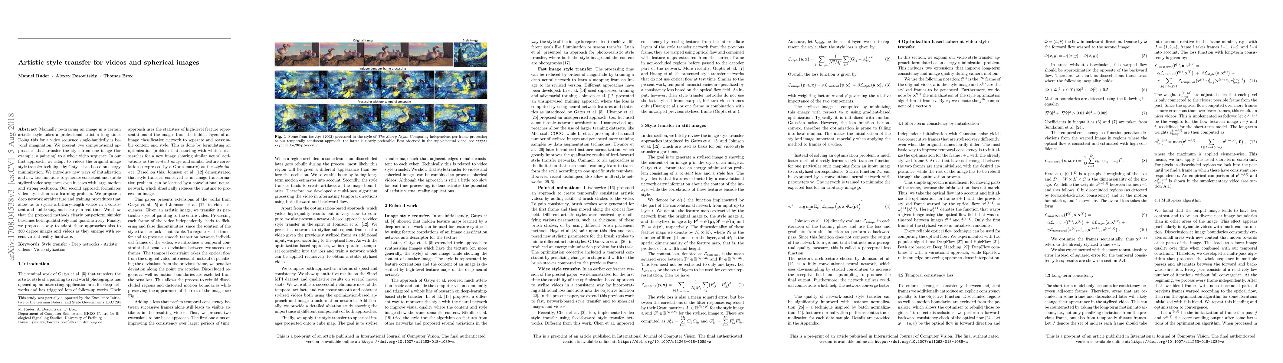 This paper presents computational methods for transferring artistic styles to video sequences and 360-degree images. It introduces an energy minimization approach adapted for videos and a deep learning method for real-time stylization, both outperforming simpler baselines and extending to virtual reality formats.