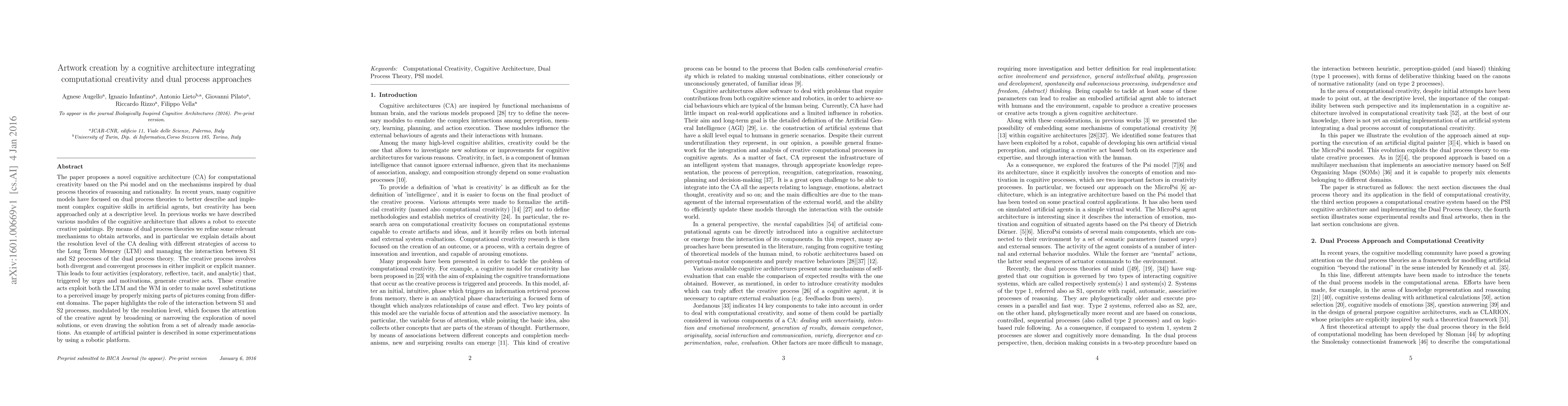 This paper introduces a new cognitive architecture for computational creativity, integrating dual process theories and the Psi model. The architecture, demonstrated through a robotic artist, successfully generates art by balancing divergent and convergent thinking, utilizing both long-term and working memory to create novel combinations of visual elements.