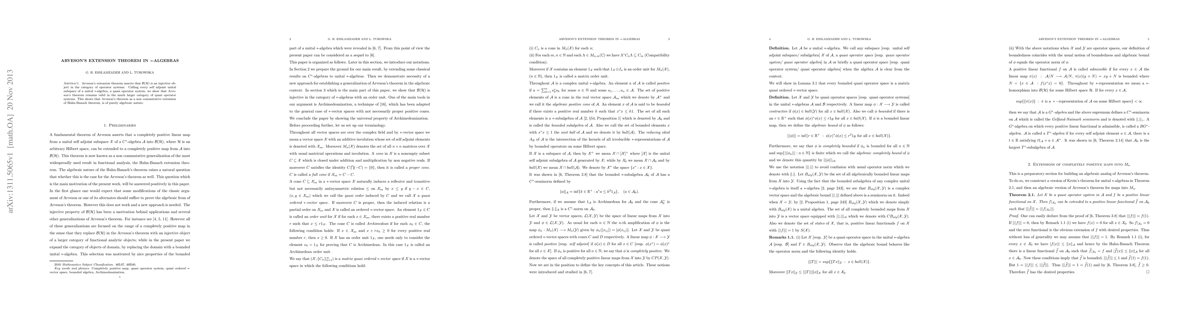 Summary: Arveson's extension theorem, which asserts the injectivity of B(H) in operator systems, is extended to quasi operator systems within unital *-algebras, demonstrating its purely algebraic nature as a non-commutative extension of the Hahn-Banach theorem.