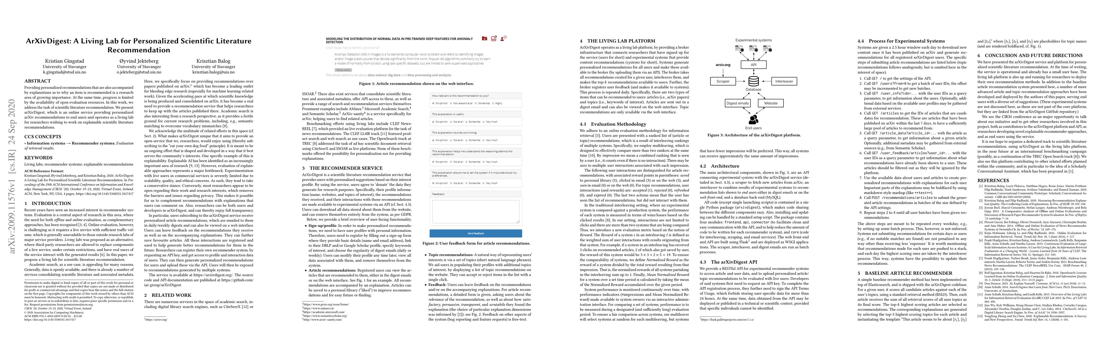 Summary: arXivDigest offers personalized recommendations for scientific literature on arXiv, aiming to enhance the explainability of recommendations. It serves as a living lab for researchers exploring explainable literature recommendation systems.