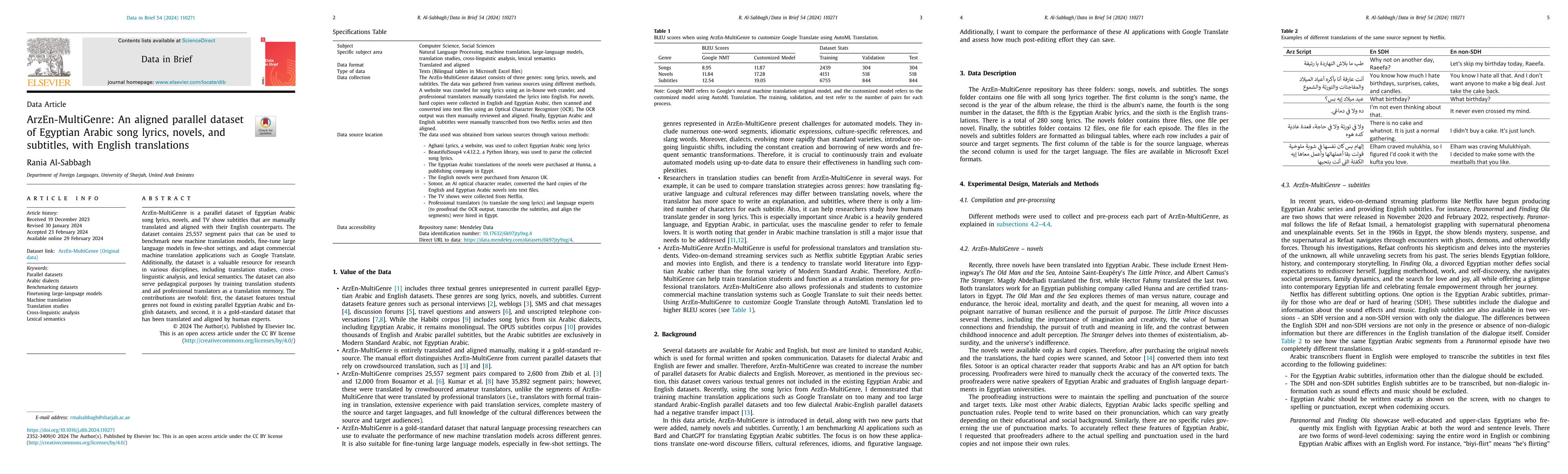 ArzEn-MultiGenre is a parallel dataset of Egyptian Arabic song lyrics, novels, and TV show subtitles that are manually translated and aligned with their English counterparts. The dataset contains 25,557 segment pairs that can be used to benchmark new machine translation models, fine-tune large language models in few-shot settings, and adapt commercial machine translation applications such as Google Translate. Additionally, the dataset is a valuable resource for research in various disciplines, including translation studies, cross-linguistic analysis, and lexical semantics. The dataset can also serve pedagogical purposes by training translation students and aid professional translators as a translation memory. The contributions are twofold: first, the dataset features textual genres not found in existing parallel Egyptian Arabic and English datasets, and second, it is a gold-standard dataset that has been translated and aligned by human experts.