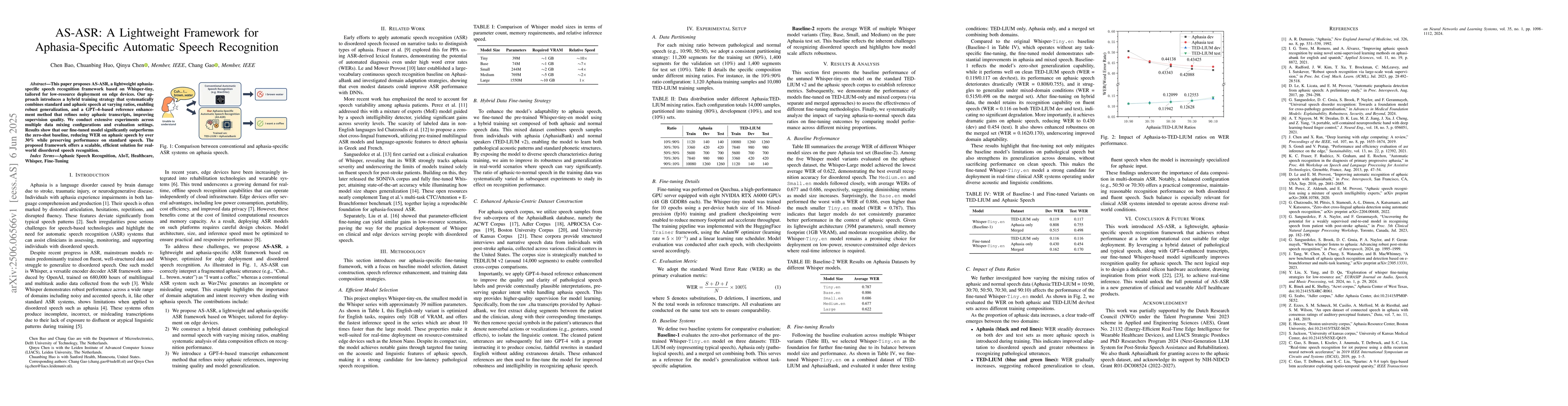 This paper proposes AS-ASR, a lightweight aphasia-specific speech recognition framework based on Whisper-tiny, tailored for low-resource deployment on edge devices. Our approach introduces a hybrid training strategy that systematically combines standard and aphasic speech at varying ratios, enabling robust generalization, and a GPT-4-based reference enhancement method that refines noisy aphasic transcripts, improving supervision quality. We conduct extensive experiments across multiple data mixing configurations and evaluation settings. Results show that our fine-tuned model significantly outperforms the zero-shot baseline, reducing WER on aphasic speech by over 30% while preserving performance on standard speech. The proposed framework offers a scalable, efficient solution for real-world disordered speech recognition.