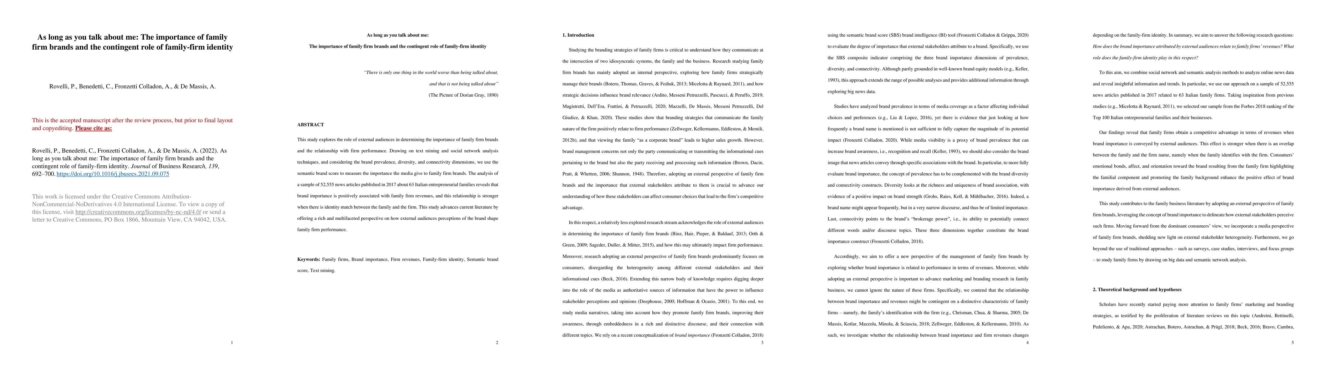 This study explores the role of external audiences in determining the importance of family firm brands and the relationship with firm performance. Drawing on text mining and social network analysis techniques, and considering the brand prevalence, diversity, and connectivity dimensions, we use the semantic brand score to measure the importance the media give to family firm brands. The analysis of a sample of 52,555 news articles published in 2017 about 63 Italian entrepreneurial families reveals that brand importance is positively associated with family firm revenues, and this relationship is stronger when there is identity match between the family and the firm. This study advances current literature by offering a rich and multifaceted perspective on how external audiences perceptions of the brand shape family firm performance.