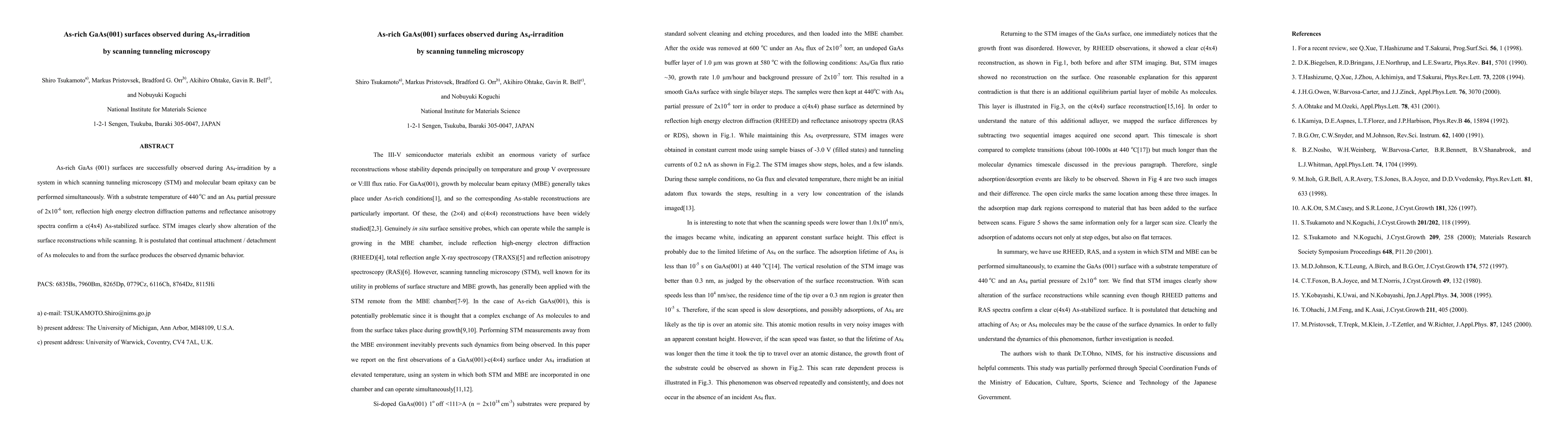Researchers observe a c(4x4) As-stabilized surface on GaAs(001) during As4 irradiation using STM and molecular beam epitaxy, revealing dynamic behavior from attachment/detachment of As molecules.