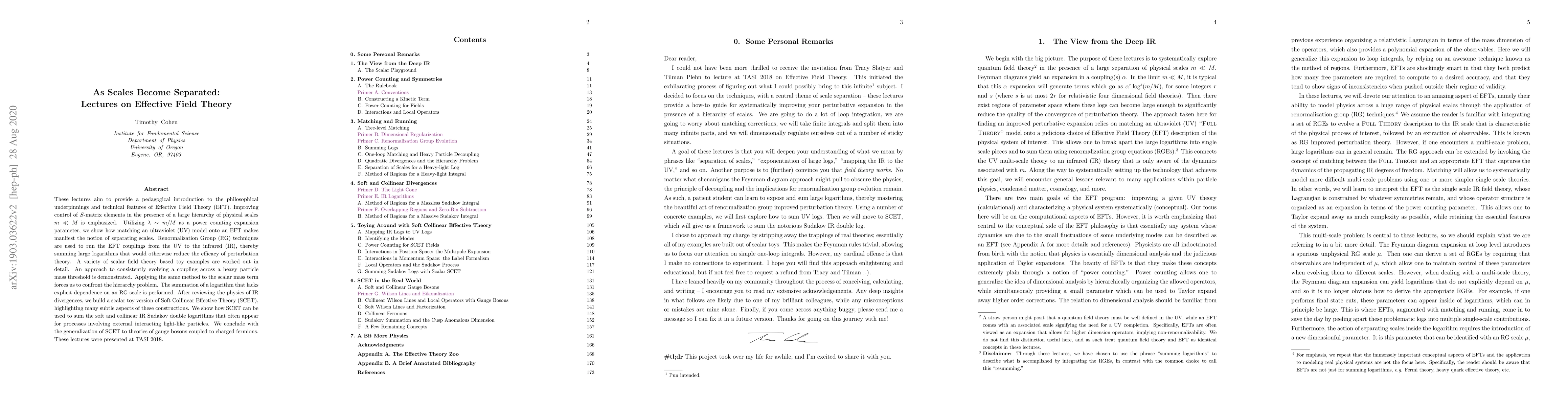 This paper offers a comprehensive introduction to Effective Field Theory (EFT), emphasizing improved control over $S$-matrix elements in systems with large scale separations. It details the application of renormalization group techniques to manage scale separation and sums significant logarithmic terms, using scalar field examples and introducing Soft Collinear Effective Theory (SCET) for managing IR divergences in processes involving light-like particles.