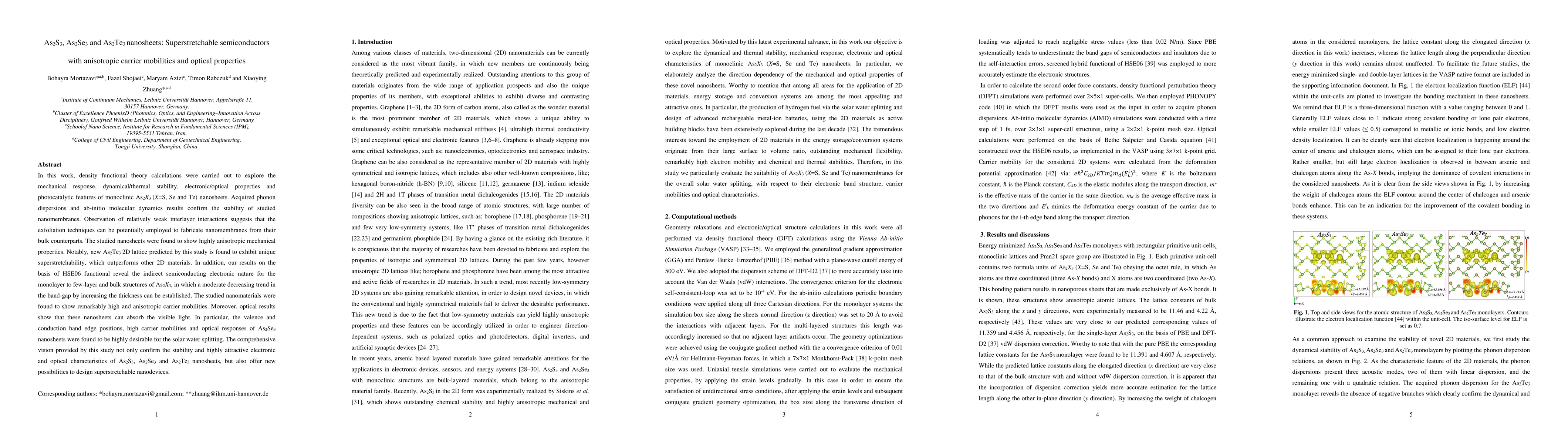 This study uses density functional theory to investigate the properties of As2X3 (X=S, Se, Te) nanosheets, revealing their stability, anisotropic mechanical properties, and unique superstretchability of As2Te3. The research highlights the potential for exfoliation and the materials' high and anisotropic carrier mobilities, along with their optical absorption capabilities, making them promising for applications in solar water splitting and flexible electronics.