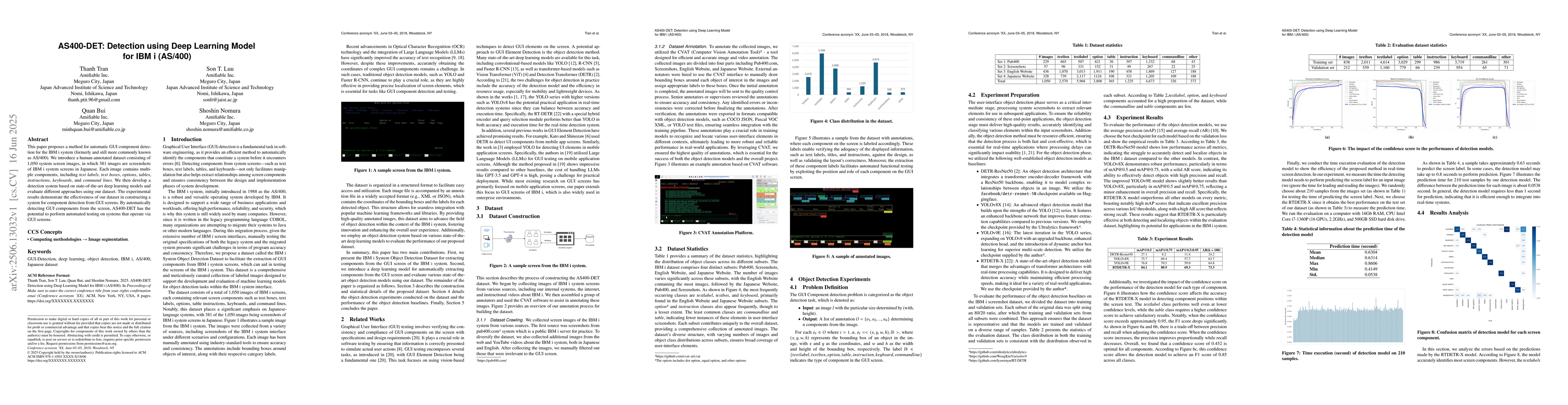 This paper proposes a method for automatic GUI component detection for the IBM i system (formerly and still more commonly known as AS/400). We introduce a human-annotated dataset consisting of 1,050 system screen images, in which 381 images are screenshots of IBM i system screens in Japanese. Each image contains multiple components, including text labels, text boxes, options, tables, instructions, keyboards, and command lines. We then develop a detection system based on state-of-the-art deep learning models and evaluate different approaches using our dataset. The experimental results demonstrate the effectiveness of our dataset in constructing a system for component detection from GUI screens. By automatically detecting GUI components from the screen, AS400-DET has the potential to perform automated testing on systems that operate via GUI screens.