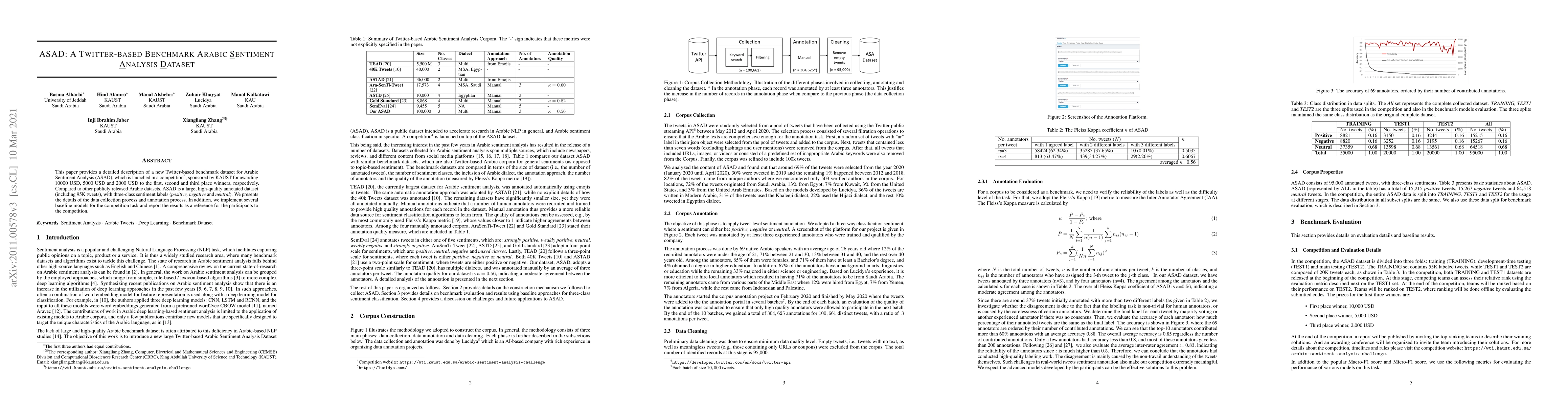 This paper introduces ASAD, a large Twitter-based benchmark dataset for Arabic Sentiment Analysis consisting of 95K tweets with three-class labels. It details the data collection and annotation processes, and includes baseline model implementations and results for competition participants.