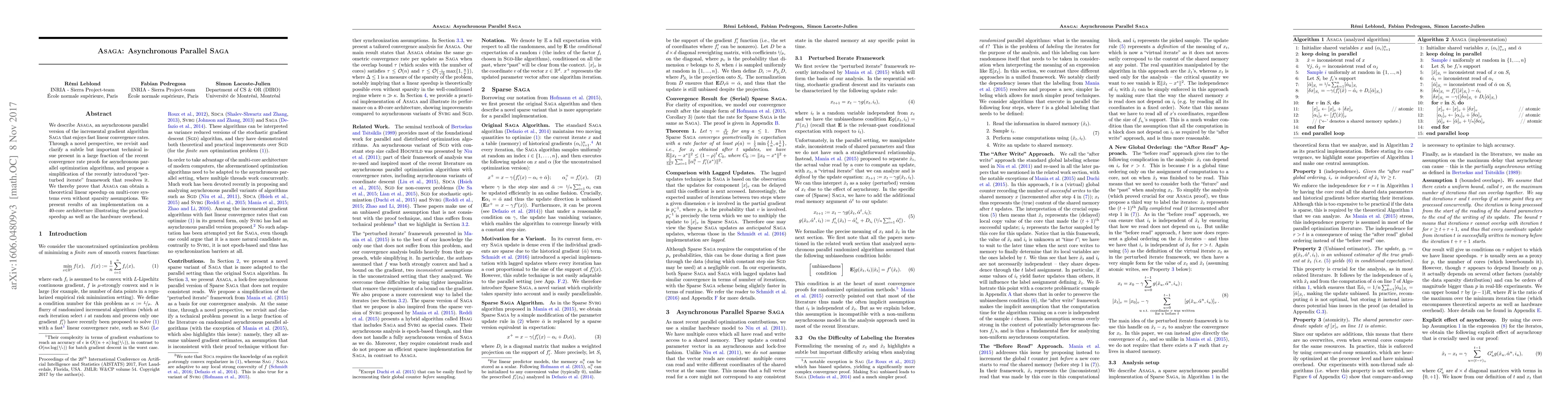 We describe ASAGA, an asynchronous parallel version of the incremental gradient algorithm SAGA that enjoys fast linear convergence rates. Through a novel perspective, we revisit and clarify a subtle but important technical issue present in a large fraction of the recent convergence rate proofs for asynchronous parallel optimization algorithms, and propose a simplification of the recently introduced "perturbed iterate" framework that resolves it. We thereby prove that ASAGA can obtain a theoretical linear speedup on multi-core systems even without sparsity assumptions. We present results of an implementation on a 40-core architecture illustrating the practical speedup as well as the hardware overhead.