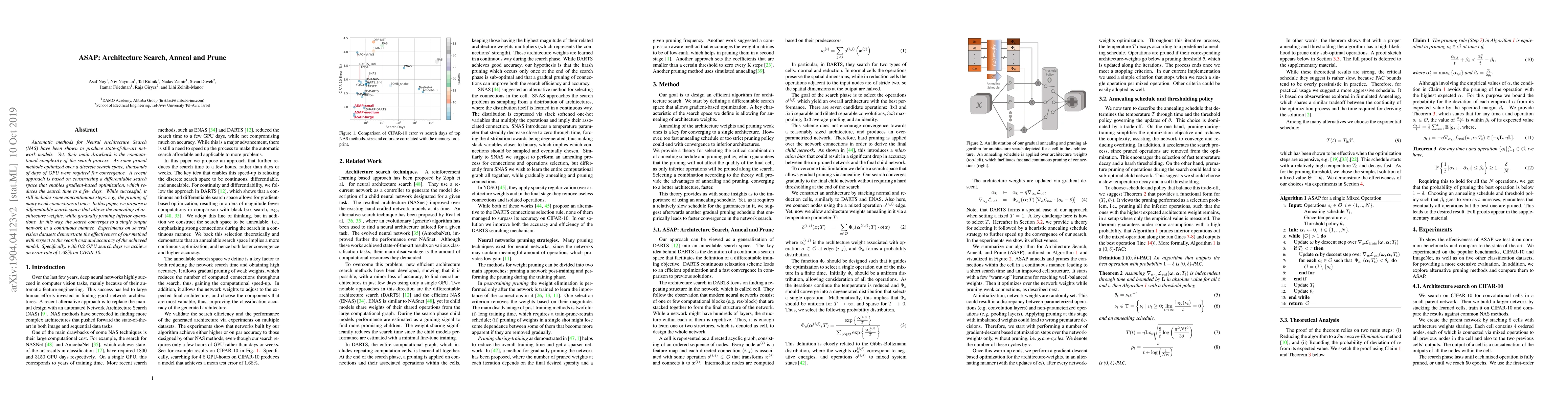 The paper introduces ASAP, a Neural Architecture Search method that continuously anneals and prunes architectures, reducing search time to 0.2 GPU days for a CIFAR-10 error rate of 1.68%. This approach refines gradient-based optimization, eliminating non-continuous steps and lowering computational complexity.