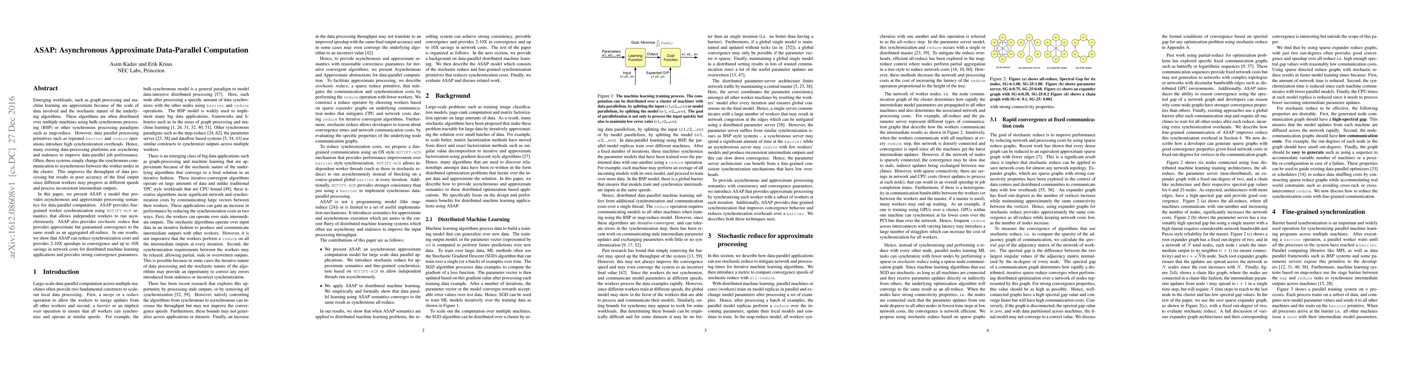 ASAP introduces asynchronous and approximate processing for data-parallel computation, offering fine-grained worker synchronization and stochastic reduce to achieve significant speedups and network cost savings while maintaining strong convergence guarantees.