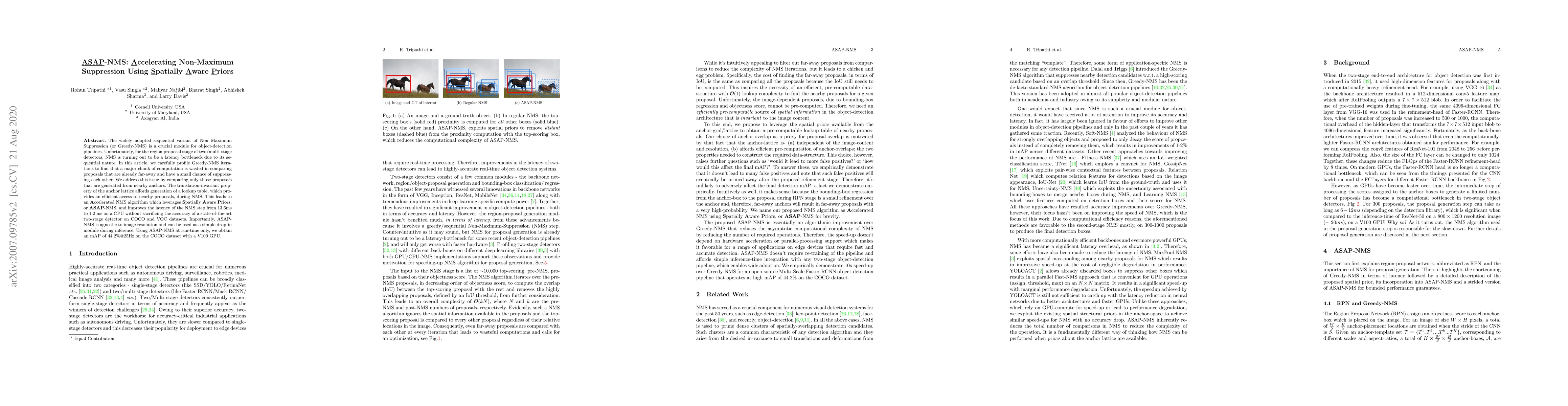 The paper introduces ASAP-NMS, a faster version of the Non-Maximum Suppression algorithm that reduces processing time by focusing on nearby proposals using spatial priors, significantly improving speed without losing detection accuracy. This method acts as a simple, effective upgrade for object detection systems, making them more efficient during inference.