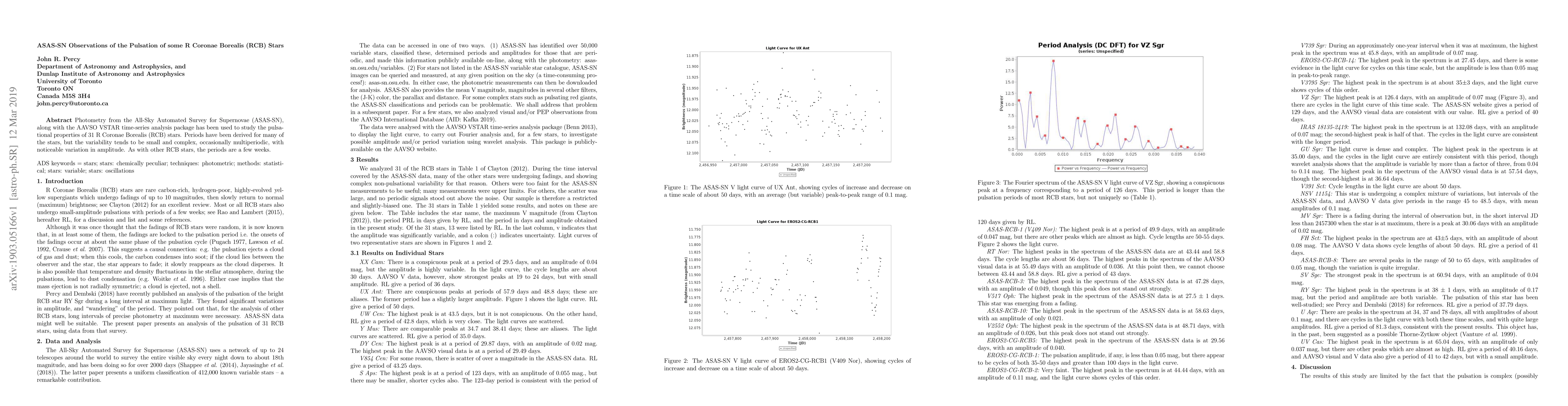 Photometry from the All-Sky Automated Survey for Supernovae (ASAS-SN), along with the AAVSO VSTAR time-series analysis package has been used to study the pulsational properties of 31 R Coronae Borealis (RCB) stars. Periods have been derived for many of the stars, but the variability tends to be small and complex, occasionally multiperiodic, with noticeable variation in amplitude. As with other RCB stars, the periods are a few weeks.
