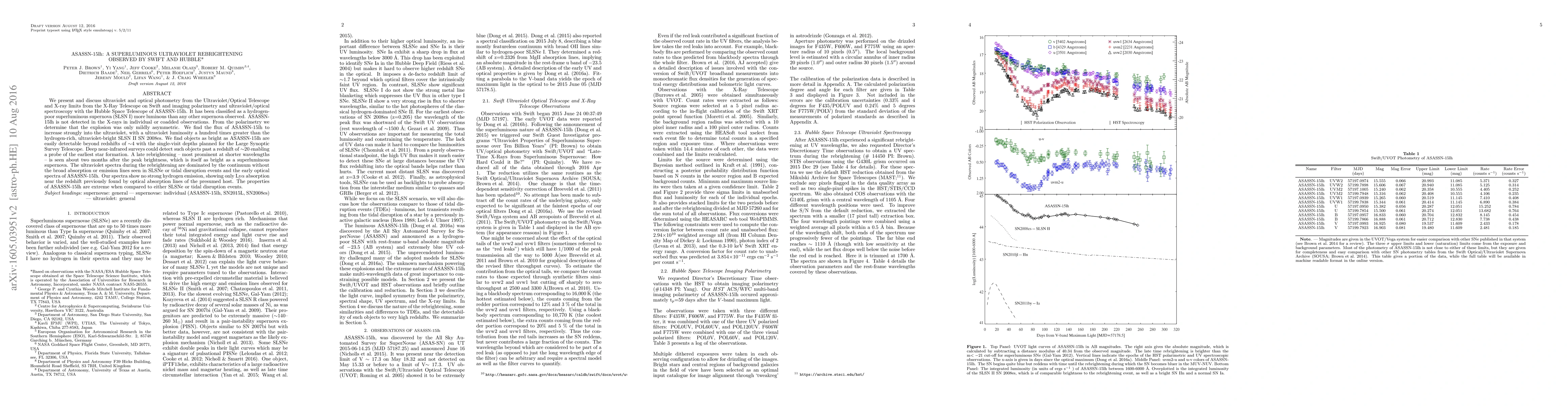 ASASSN-15lh, a hydrogen-poor superluminous supernova (SLSN I), exhibits a late ultraviolet rebrightening and is more luminous than any other observed supernova. Its ultraviolet luminosity is significantly higher than that of hydrogen-rich SLSN II, and it is detectable at high redshifts with future surveys.