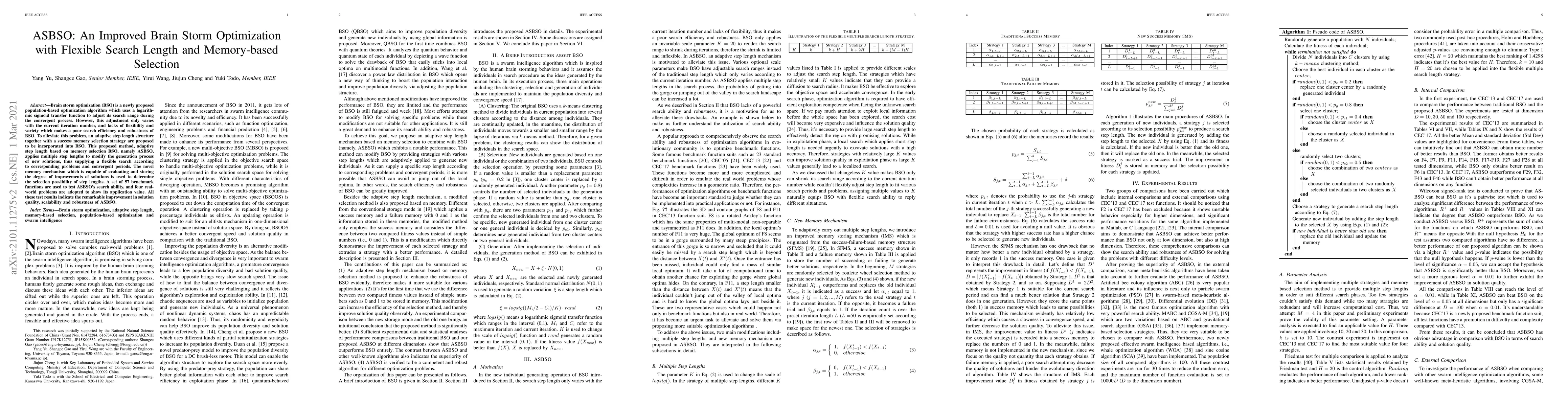 Brain storm optimization (BSO) is a newly proposed population-based optimization algorithm, which uses a logarithmic sigmoid transfer function to adjust its search range during the convergent process. However, this adjustment only varies with the current iteration number and lacks of flexibility and variety which makes a poor search effciency and robustness of BSO. To alleviate this problem, an adaptive step length structure together with a success memory selection strategy is proposed to be incorporated into BSO. This proposed method, adaptive step length based on memory selection BSO, namely ASBSO, applies multiple step lengths to modify the generation process of new solutions, thus supplying a flexible search according to corresponding problems and convergent periods. The novel memory mechanism, which is capable of evaluating and storing the degree of improvements of solutions, is used to determine the selection possibility of step lengths. A set of 57 benchmark functions are used to test ASBSO's search ability, and four real-world problems are adopted to show its application value. All these test results indicate the remarkable improvement in solution quality, scalability, and robustness of ASBSO.