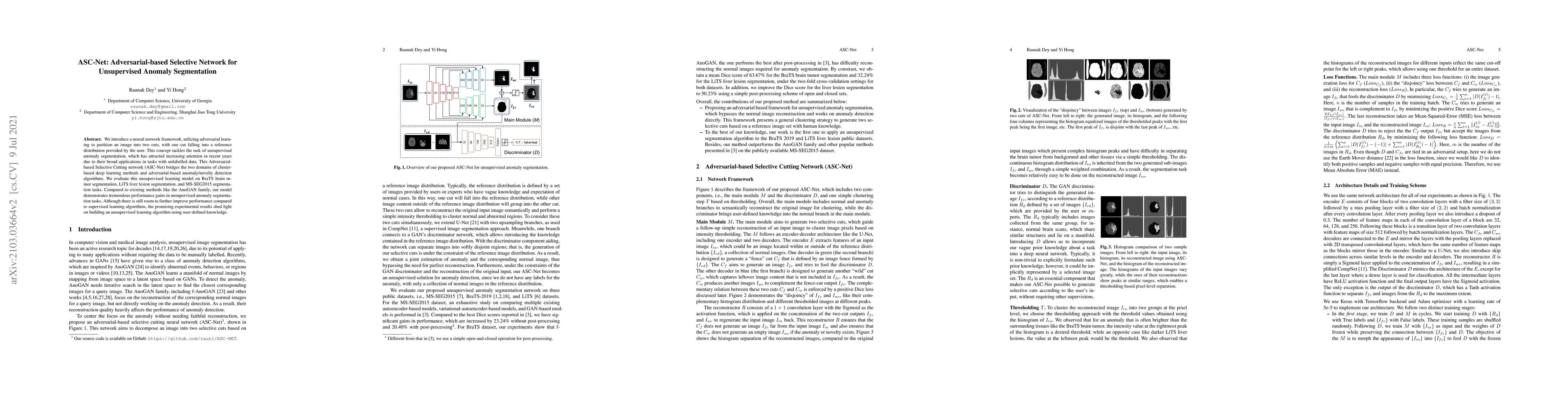 ASC-Net employs adversarial learning to segment anomalies in images without labeled data, bridging cluster-based deep learning and adversarial detection. It shows significant performance improvements over existing methods in tasks like brain tumor and liver lesion segmentation.