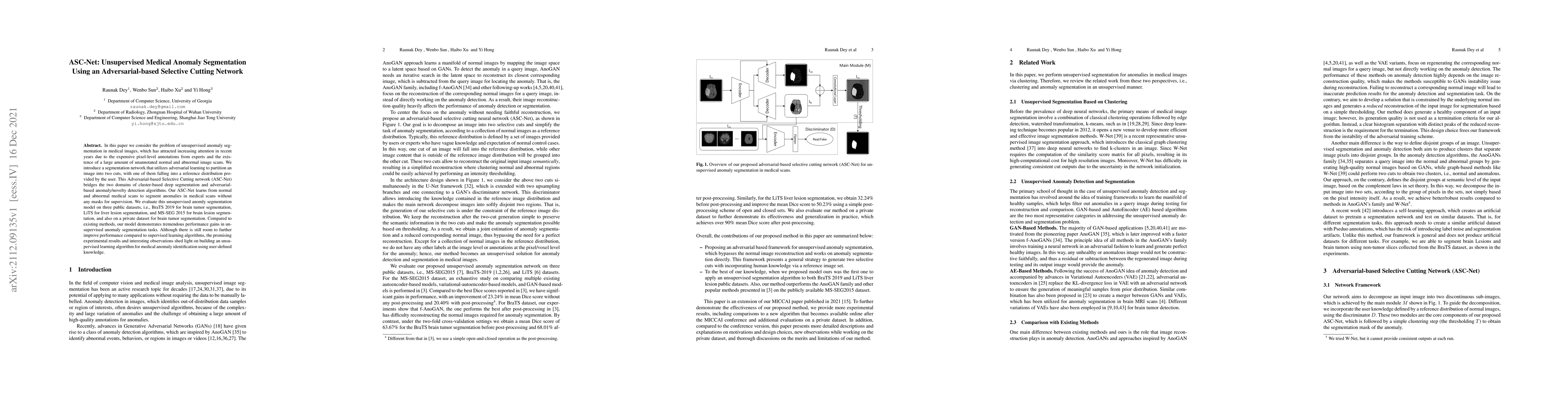 ASC-Net is an unsupervised segmentation network that uses adversarial learning to segment anomalies in medical images without requiring expert annotations. It demonstrates significant performance improvements over existing methods in tasks like brain tumor and liver lesion segmentation.