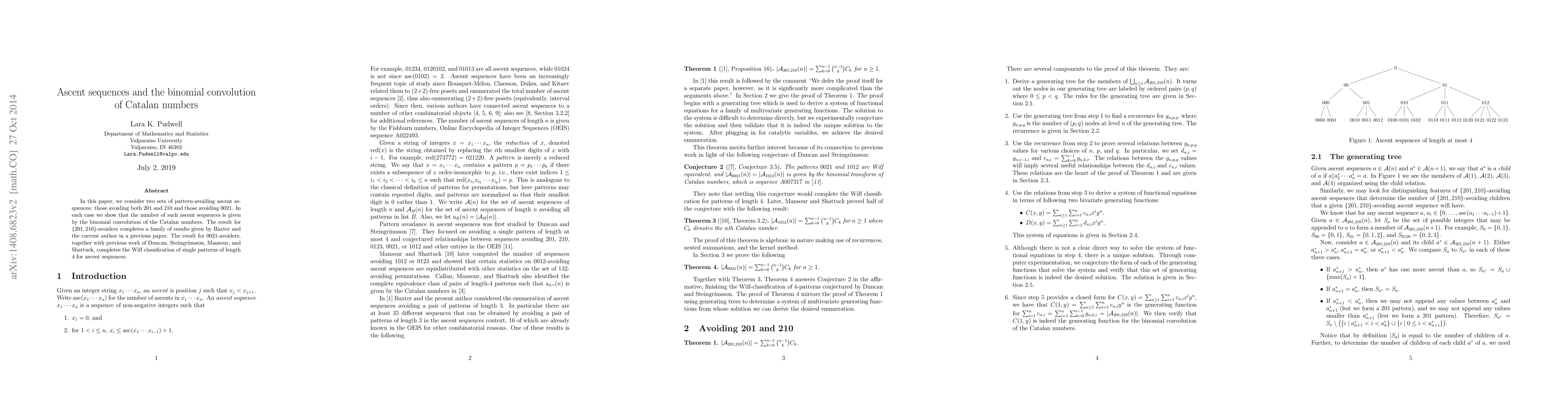 The paper shows that two sets of pattern-avoiding ascent sequences can be represented as the binomial convolution of Catalan numbers, contributing to our understanding of single patterns in length 4 for ascent sequences.