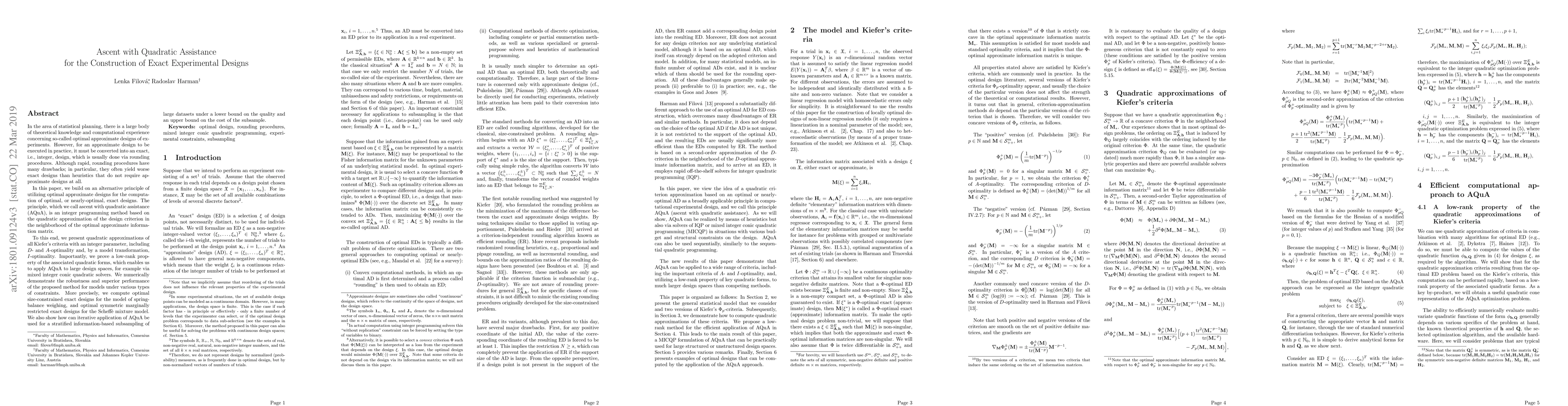 In the area of statistical planning, there is a large body of theoretical knowledge and computational experience concerning so-called optimal approximate designs of experiments. However, for an approximate design to be executed in practice, it must be converted into an exact, i.e., integer, design, which is usually done via rounding procedures. Although rapid, rounding procedures have many drawbacks; in particular, they often yield worse exact designs than heuristics that do not require approximate designs at all. In this paper, we build on an alternative principle of utilizing optimal approximate designs for the computation of optimal, or nearly-optimal, exact designs. The principle, which we call ascent with quadratic assistance (AQuA), is an integer programming method based on the quadratic approximation of the design criterion in the neighborhood of the optimal approximate information matrix. To this end, we present quadratic approximations of all Kiefer's criteria with an integer parameter, including D- and A-optimality and, by a model transformation, I-optimality. Importantly, we prove a low-rank property of the associated quadratic forms, which enables us to apply AQuA to large design spaces, for example via mixed integer conic quadratic solvers. We numerically demonstrate the robustness and superior performance of the proposed method for models under various types of constraints. More precisely, we compute optimal size-constrained exact designs for the model of spring-balance weighing, and optimal symmetric marginally restricted exact designs for the Scheffe mixture model. We also show how can iterative application of AQuA be used for a stratified information-based subsampling of large datasets under a lower bound on the quality and an upper bound on the cost of the subsample.