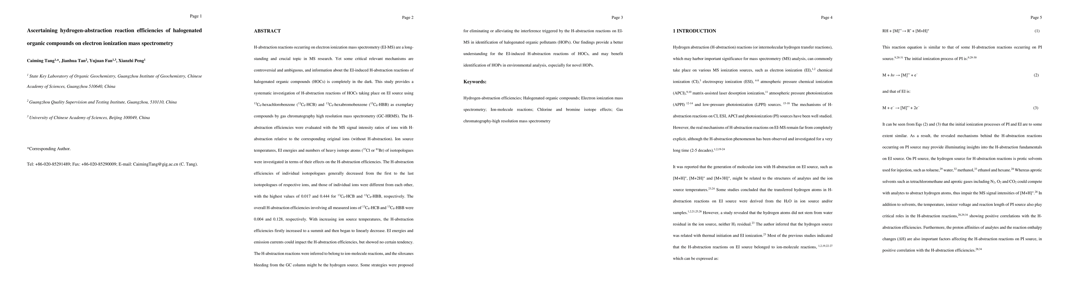 This study systematically investigates hydrogen-abstraction reactions in halogenated organic compounds (HOCs) during electron ionization mass spectrometry (EI-MS), using 13C6-hexachlorobenzene and 13C6-hexabromobenzene as examples. The findings reveal varying H-abstraction efficiencies influenced by ion source temperatures, EI energies, and the number of halogen atoms, providing strategies to mitigate interference in identifying halogenated organic pollutants (HOPs).