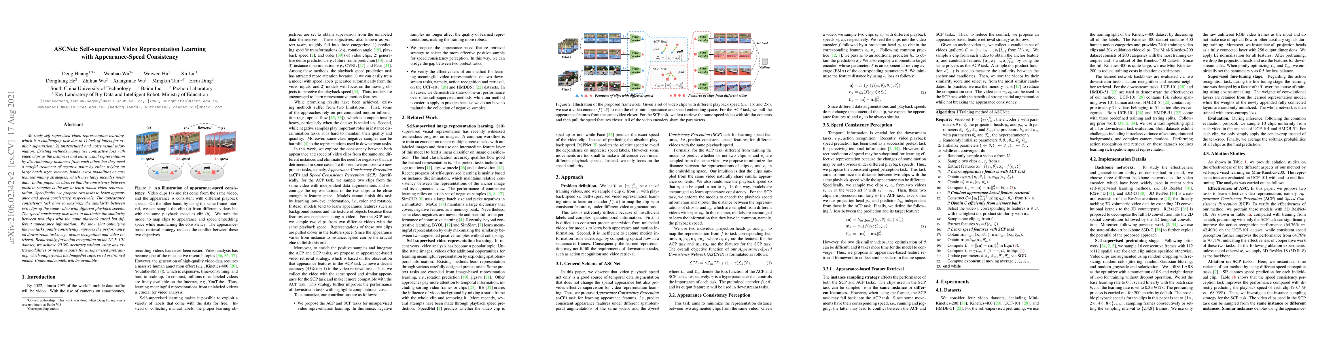 ASCNet proposes self-supervised video representation learning through appearance-speed consistency tasks, achieving robust video representations without labeled data. The method maximizes similarity between clips with varied playback speeds and appearances, leading to superior performance in action recognition and video retrieval.