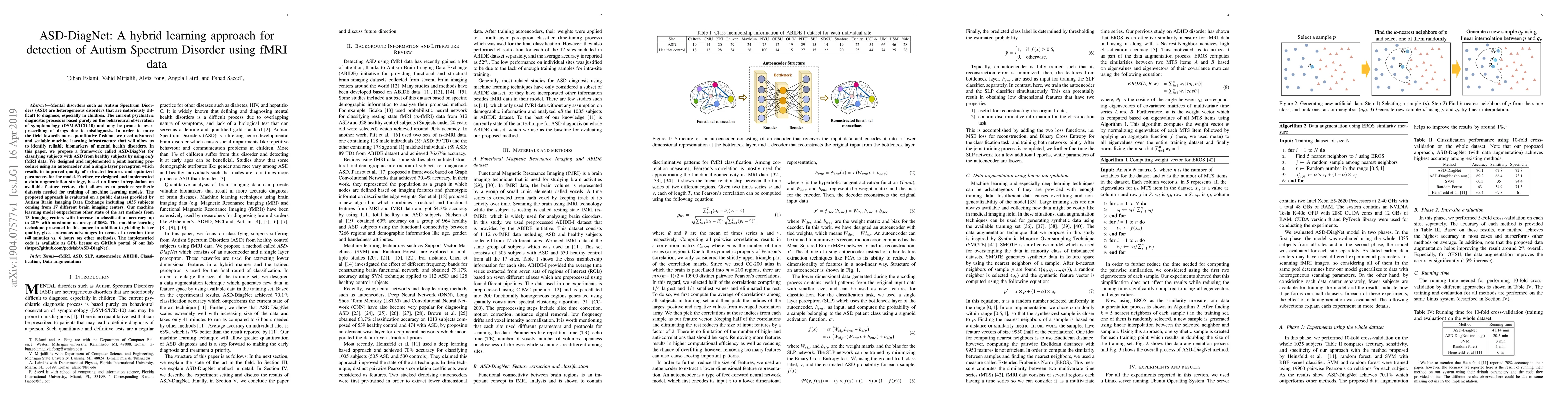 ASD-DiagNet employs a hybrid learning approach combining autoencoders and single layer perceptrons to classify Autism Spectrum Disorder from fMRI data, achieving up to 80% accuracy and significantly reducing execution time compared to other methods. The framework also utilizes data augmentation to enhance training datasets.