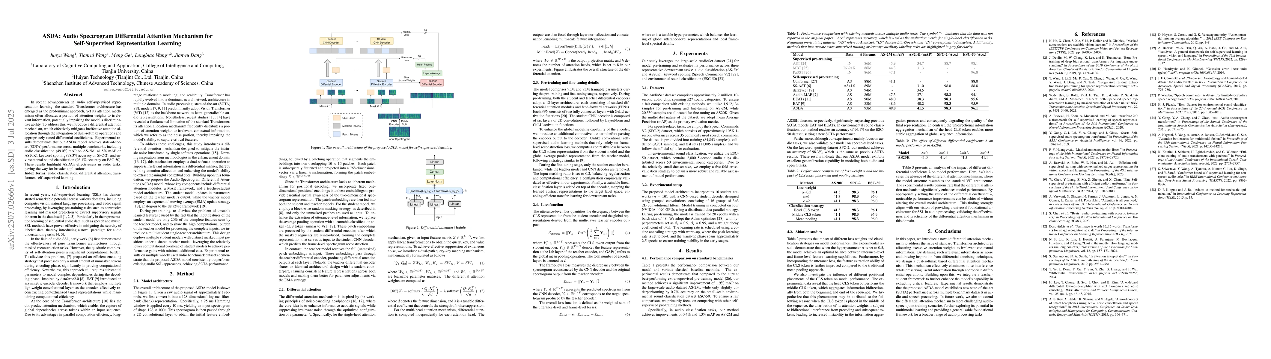 In recent advancements in audio self-supervised representation learning, the standard Transformer architecture has emerged as the predominant approach, yet its attention mechanism often allocates a portion of attention weights to irrelevant information, potentially impairing the model's discriminative ability. To address this, we introduce a differential attention mechanism, which effectively mitigates ineffective attention allocation through the integration of dual-softmax operations and appropriately tuned differential coefficients. Experimental results demonstrate that our ASDA model achieves state-of-the-art (SOTA) performance across multiple benchmarks, including audio classification (49.0% mAP on AS-2M, 41.5% mAP on AS20K), keyword spotting (98.3% accuracy on SPC-2), and environmental sound classification (96.1% accuracy on ESC-50). These results highlight ASDA's effectiveness in audio tasks, paving the way for broader applications.
