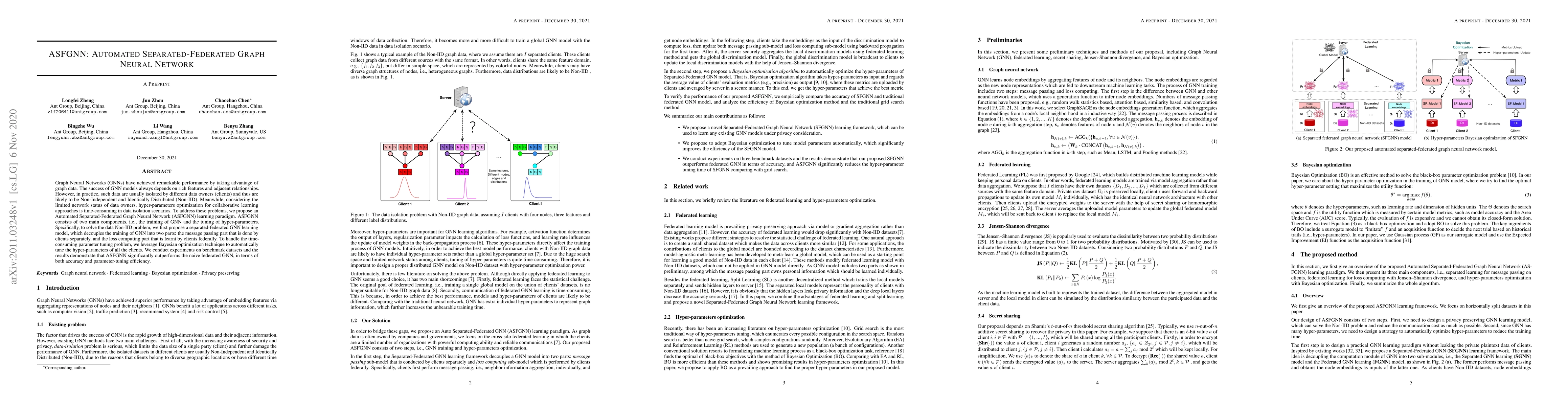 Graph Neural Networks (GNNs) have achieved remarkable performance by taking advantage of graph data. The success of GNN models always depends on rich features and adjacent relationships. However, in practice, such data are usually isolated by different data owners (clients) and thus are likely to be Non-Independent and Identically Distributed (Non-IID). Meanwhile, considering the limited network status of data owners, hyper-parameters optimization for collaborative learning approaches is time-consuming in data isolation scenarios. To address these problems, we propose an Automated Separated-Federated Graph Neural Network (ASFGNN) learning paradigm. ASFGNN consists of two main components, i.e., the training of GNN and the tuning of hyper-parameters. Specifically, to solve the data Non-IID problem, we first propose a separated-federated GNN learning model, which decouples the training of GNN into two parts: the message passing part that is done by clients separately, and the loss computing part that is learnt by clients federally. To handle the time-consuming parameter tuning problem, we leverage Bayesian optimization technique to automatically tune the hyper-parameters of all the clients. We conduct experiments on benchmark datasets and the results demonstrate that ASFGNN significantly outperforms the naive federated GNN, in terms of both accuracy and parameter-tuning efficiency.