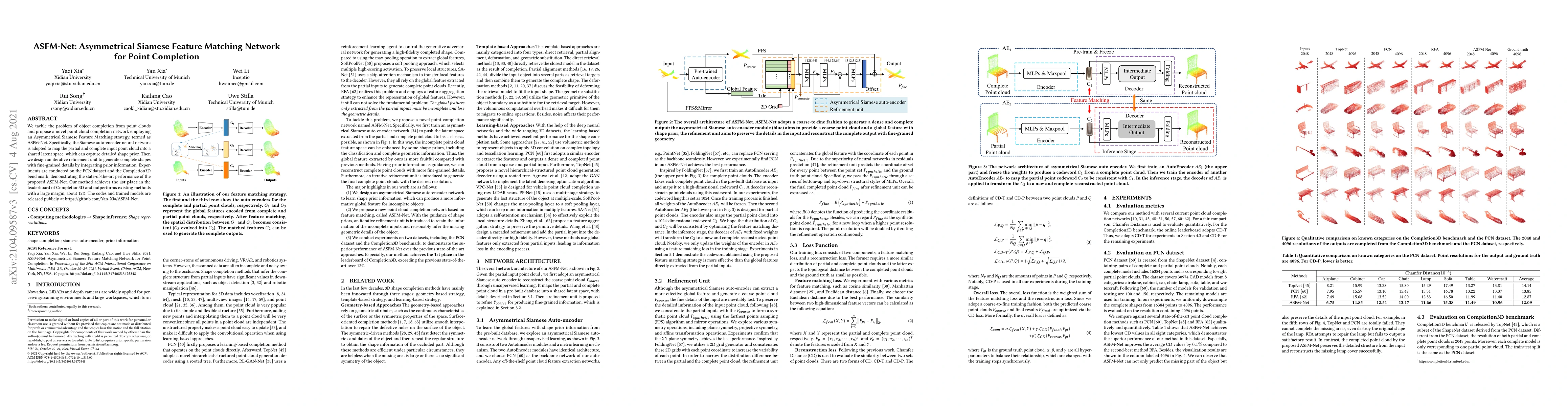 ASFM-Net is a novel asymmetrical Siamese feature matching network designed for point cloud completion, achieving state-of-the-art performance on PCN and Completion3D datasets, outperforming existing methods by about 12%. The network uses a Siamese auto-encoder to map partial and complete point clouds into a shared latent space for shape prior capture and iterative refinement for fine-grained details.
