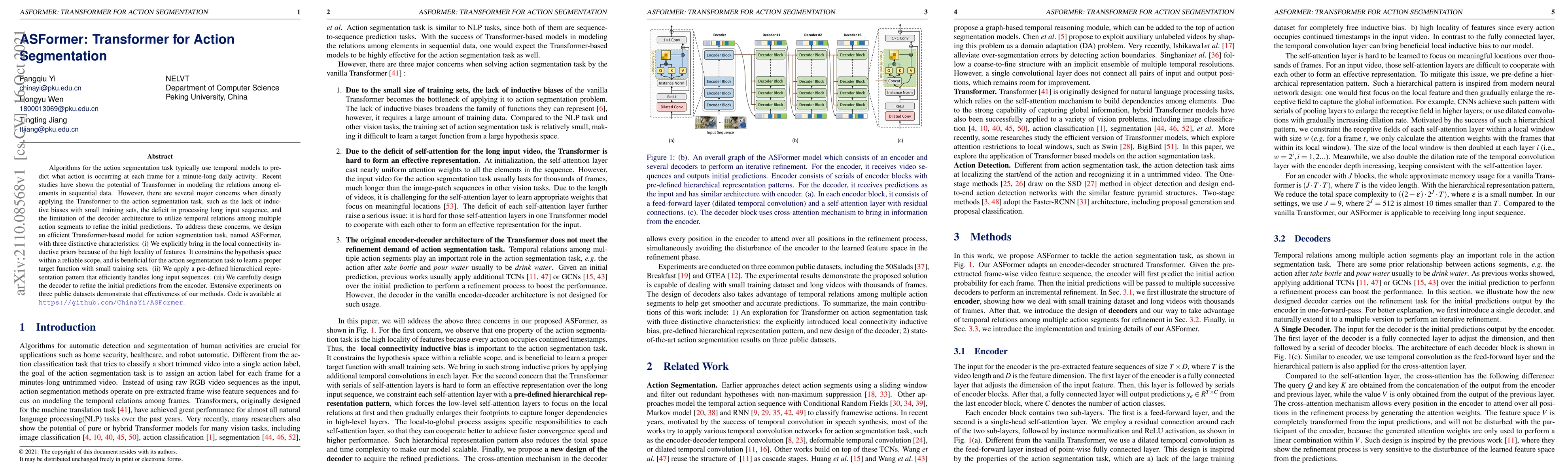 The paper proposes ASFormer, a Transformer-based model for the action segmentation task, addressing concerns like lack of inductive biases with small datasets, processing long sequences, and utilizing temporal relations among action segments.