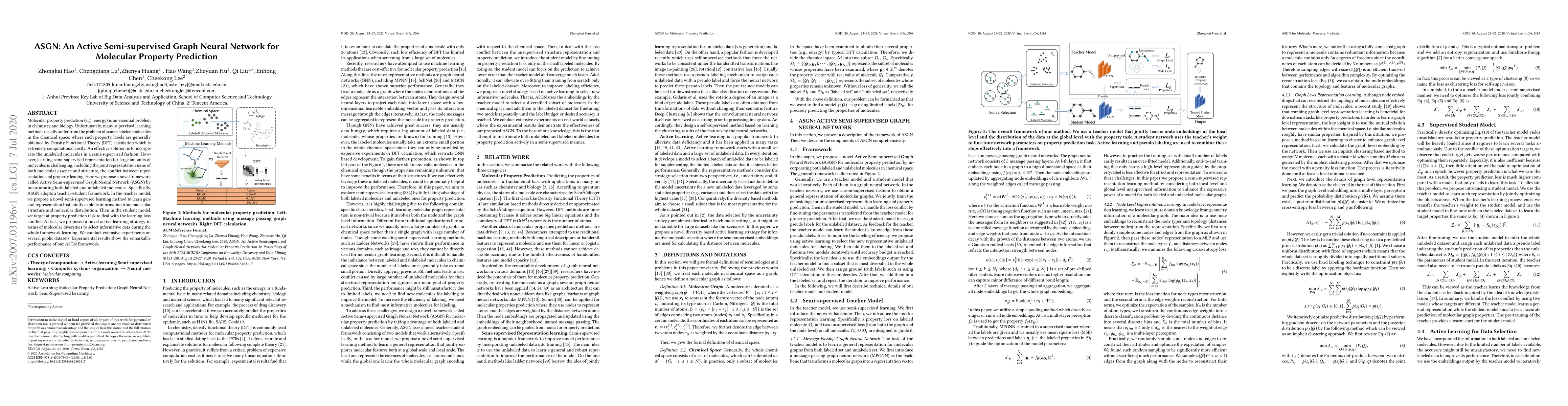 The paper proposes ASGN, an Active Semi-supervised Graph Neural Network for predicting molecular properties by leveraging both labeled and unlabeled data. ASGN uses a teacher-student framework to learn general representations and address the conflict between representation and property prediction, achieving notable performance on public datasets.