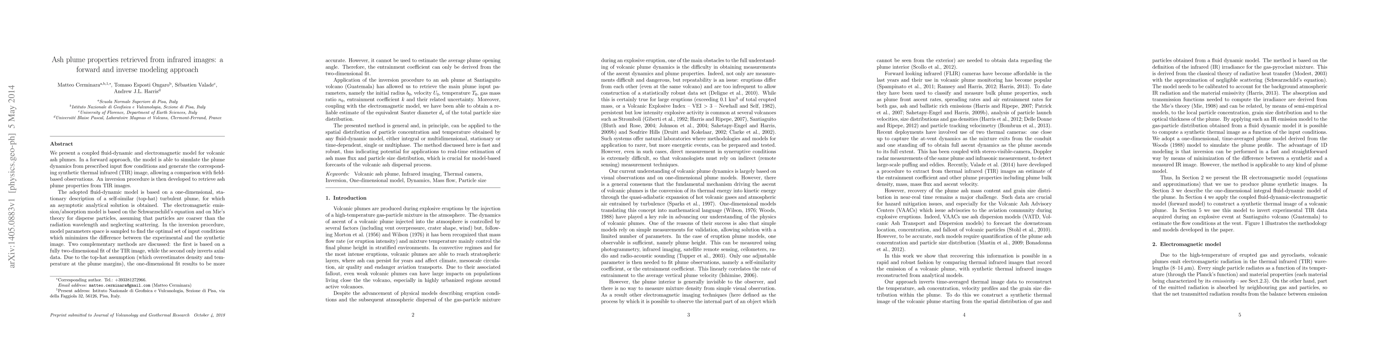 This paper presents a coupled fluid-dynamic and electromagnetic model to simulate and retrieve properties of volcanic ash plumes from thermal infrared images. The model retrieves parameters like initial radius, velocity, temperature, and particle size distribution, demonstrating its potential for real-time ash mass flux and dispersal forecasting.