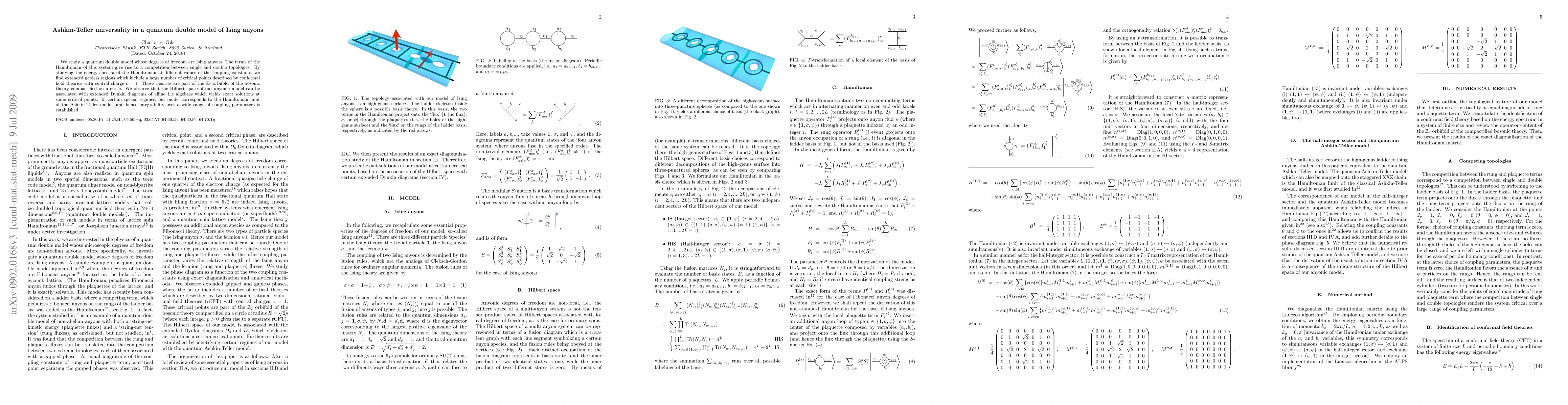We study a quantum double model whose degrees of freedom are Ising anyons. The terms of the Hamiltonian of this system give rise to a competition between single and double topologies. By studying the energy spectra of the Hamiltonian at different values of the coupling constants, we find extended gapless regions which include a large number of critical points described by conformal field theories with central charge c=1. These theories are part of the Z_2 orbifold of the bosonic theory compactified on a circle. We observe that the Hilbert space of our anyonic model can be associated with extended Dynkin diagrams of affine Lie algebras which yields exact solutions at some critical points. In certain special regimes, our model corresponds to the Hamiltonian limit of the Ashkin-Teller model, and hence integrability over a wide range of coupling parameters is established.