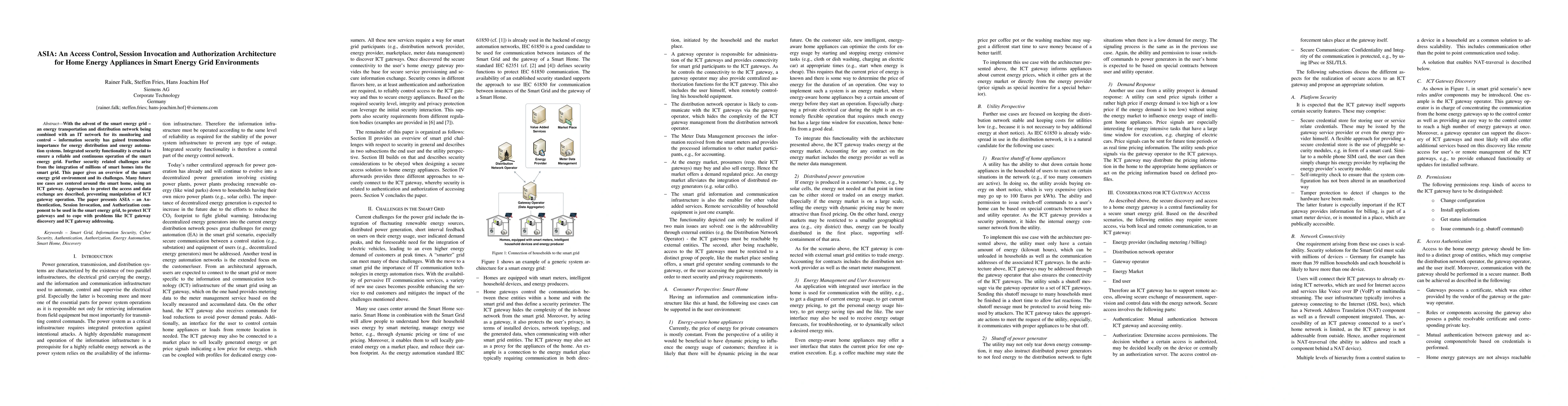 This paper introduces ASIA, an architecture for securing access control, session invocation, and authorization in smart energy grids, addressing the challenges of integrating millions of smart homes. It emphasizes the importance of integrated security to ensure reliable operation and describes methods to protect ICT gateways from manipulation.