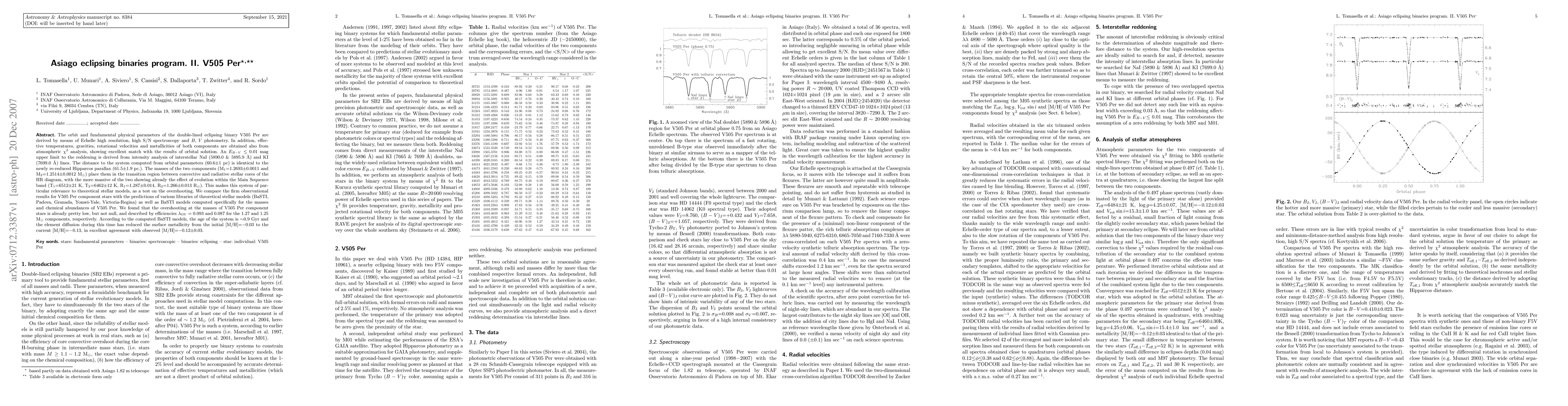 The orbit and fundamental physical parameters of the double-lined eclipsing binary V505 Per are derived by means of Echelle high resolution, high S/N spectroscopy and B, V photometry. Effective temperatures, gravities, rotational velocities and metallicities are obtained from atmospheric chi^2 analysis. An E(B-V)<=0.01 mag reddening is derived from interstellar NaI and KI lines. The distance to the system computed from orbital parameters (60.6 +/- 1 pc) is identical to the newly re-reduced Hipparcos parallax (61.5 +/- 1.9 pc). The masses of the two components (M(1) = 1.2693 +/- 0.0011 and M(2) = 1.2514 +/- 0.0012 Msun) place them in the transition region between convective and radiative stellar cores of the HR diagram, with the more massive of the two showing already the effect of evolution within the Main Sequence band (T(1) = 6512 +/- 21 K, T(2) = 6462 +/- 12 K, R(1) = 1.287 +/- 0.014, R(2) = 1.266 +/- 0.013 Rsun). This makes this system of particular relevance to theoretical stellar models, as a test on the overshooting. We compare the firm observational results for V505 Per component stars with the predictions of various libraries of theoretical stellar models (BaSTI, Padova, Granada, Yonsei-Yale, Victoria-Regina) as well as BaSTI models computed specifically for the masses and chemical abundances of V505 Per. We found that the overshooting at the masses of V505 Per component stars is already pretty low, but not null, and described by efficiencies lambda(OV)=0.093 and 0.087 for the 1.27 and 1.25 Msun components, respectively. According to the computed BaSTI models, the age of the system is about 0.9 Gyr and the element diffusion during this time has reduced the surface metallicity from the initial [M/H]=-0.03 to the current [M/H]=-0.13, in excellent agreement with observed [M/H]=-0.12 +/- 0.03.