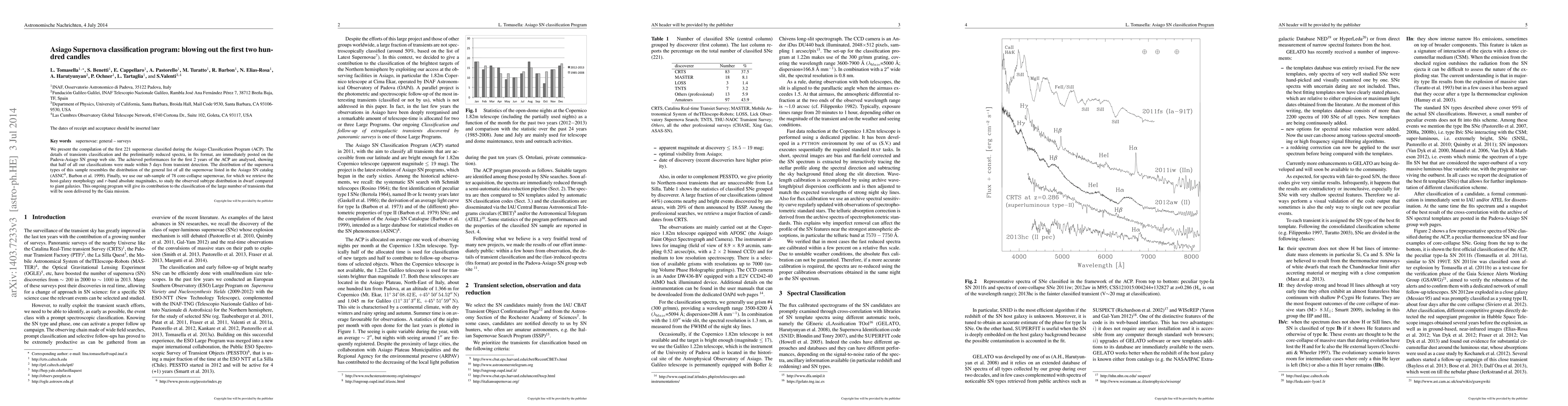 We present the compilation of the first 221 supernovae classified during the Asiago Classification Program (ACP). The details of transients classification and the preliminarily reduced spectra, in fits format, are immediately posted on the Padova-Asiago SN group web site. The achieved performances for the first 2 years of the ACP are analysed, showing that half of all our classifications were made within 5 days from transient detection. The distribution of the supernova types of this sample resembles the distribution of the general list of all the supernovae listed in the Asiago SN catalog (ASNC, Barbon et al. 1999). Finally, we use our sub-sample of 78 core-collapse supernovae, for which we retrieve the host-galaxy morphology and r-band absolute magnitudes, to study the observed subtype distribution in dwarf compared to giant galaxies. This ongoing program will give its contribution to the classification of the large number of transients that will be soon delivered by the Gaia mission.