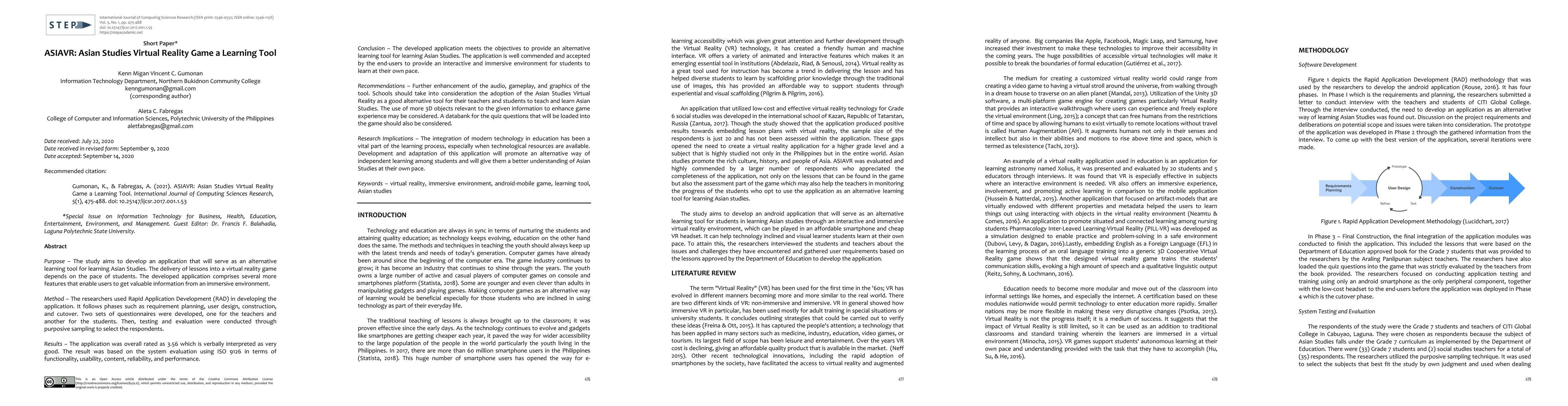 The study developed ASIAVR, a virtual reality game for learning Asian Studies, using Rapid Application Development. The application was rated very good and well-accepted by users, providing an interactive and immersive learning environment. Further enhancements and additional features are suggested for future improvements.