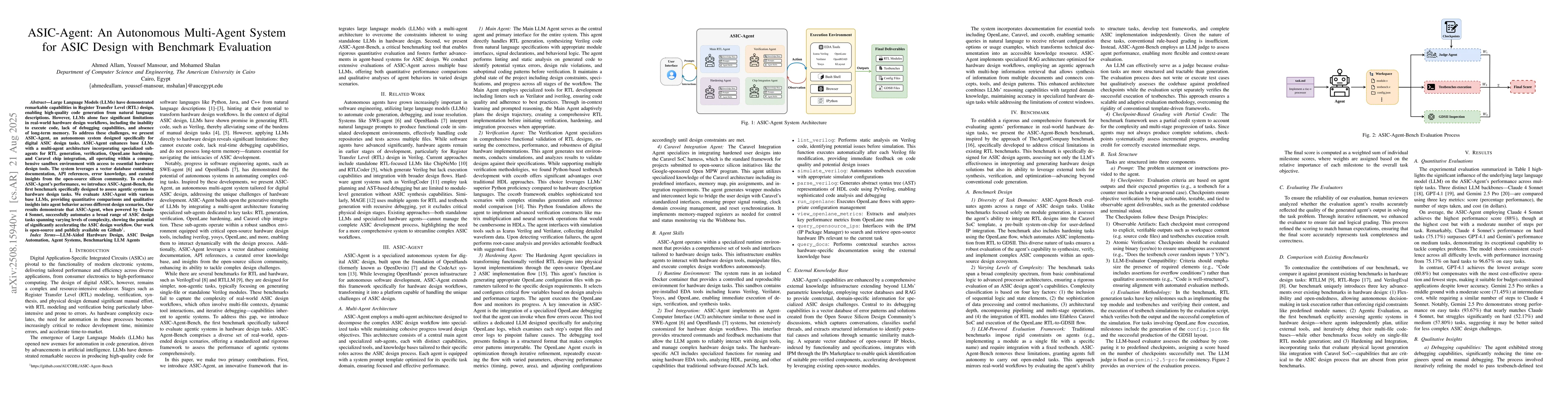 Large Language Models (LLMs) have demonstrated remarkable capabilities in Register Transfer Level (RTL) design, enabling high-quality code generation from natural language descriptions. However, LLMs alone face significant limitations in real-world hardware design workflows, including the inability to execute code, lack of debugging capabilities, and absence of long-term memory. To address these challenges, we present ASIC-Agent, an autonomous system designed specifically for digital ASIC design tasks. ASIC-Agent enhances base LLMs with a multi-agent architecture incorporating specialized sub-agents for RTL generation, verification, OpenLane hardening, and Caravel chip integration, all operating within a comprehensive sandbox environment with access to essential hardware design tools. The system leverages a vector database containing documentation, API references, error knowledge, and curated insights from the open-source silicon community. To evaluate ASIC-Agent's performance, we introduce ASIC-Agent-Bench, the first benchmark specifically designed to assess agentic systems in hardware design tasks. We evaluate ASIC-Agent with various base LLMs, providing quantitative comparisons and qualitative insights into agent behavior across different design scenarios. Our results demonstrate that ASIC-Agent, when powered by Claude 4 Sonnet, successfully automates a broad range of ASIC design tasks spanning varying levels of complexity, showing the potential of significantly accelerating the ASIC design workflow.