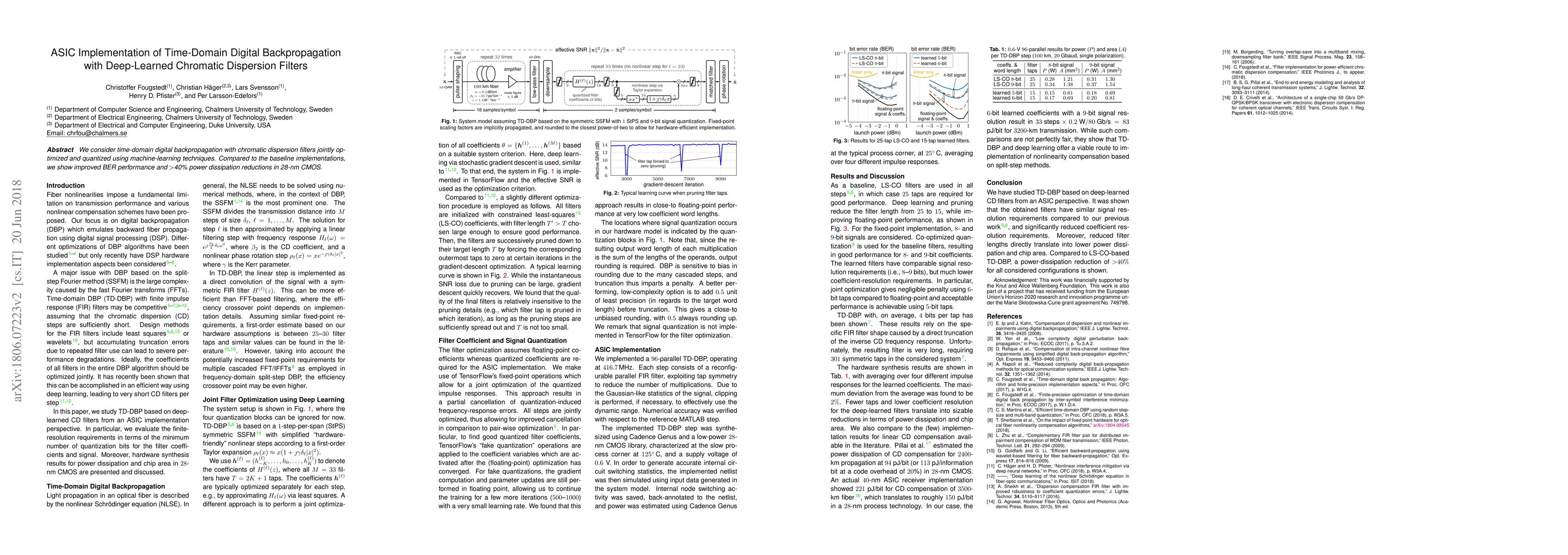 We consider time-domain digital backpropagation with chromatic dispersion filters jointly optimized and quantized using machine-learning techniques. Compared to the baseline implementations, we show improved BER performance and >40% power dissipation reductions in 28-nm CMOS.