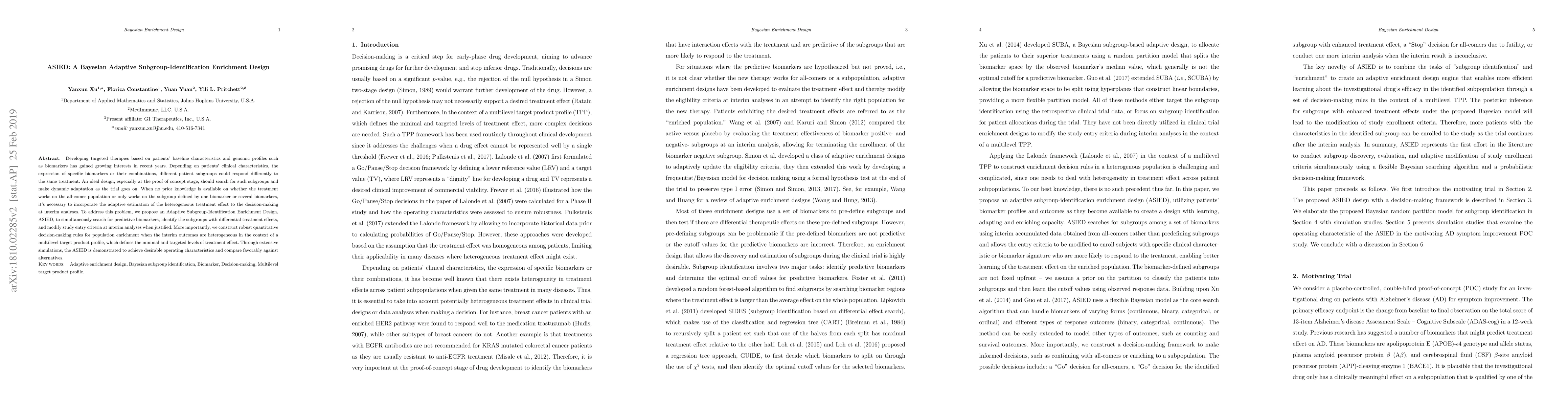 The ASIED design proposes a Bayesian adaptive subgroup-identification enrichment method to identify subgroups responding differently to treatment, with robust decision-making rules for population enrichment. It demonstrates desirable operating characteristics through extensive simulations.