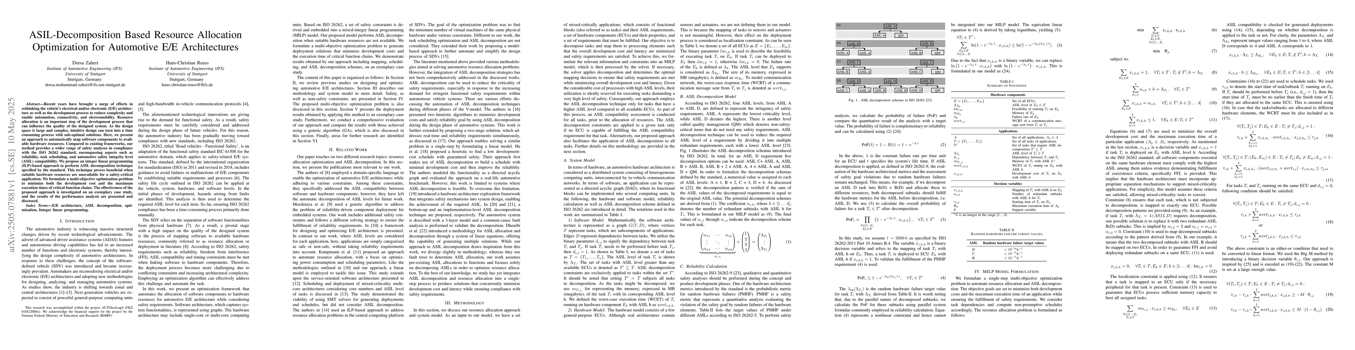 The research proposes an ILP-based approach for ASIL decomposition technique to allocate resources in automotive E/E architectures, optimizing for development cost and max execution times of critical function chains.